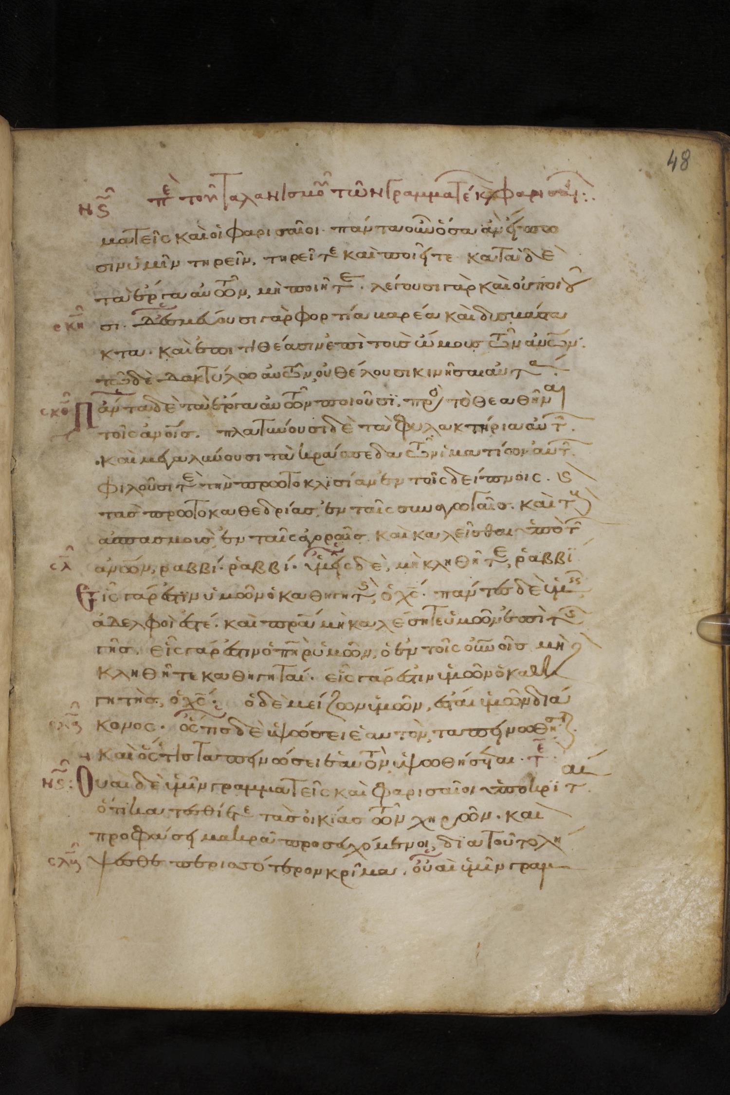 Thirteenth century minuscule of the Gospels on parchment; 172 leaves, 1 column, 20-30 lines per column. Images were taken at the National Library of Greece in Athens.