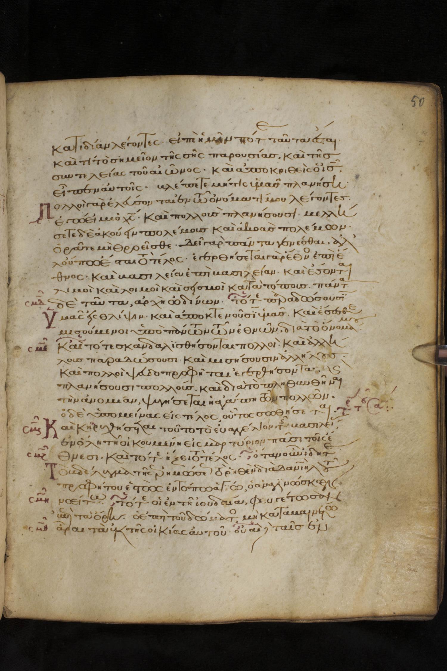 Thirteenth century minuscule of the Gospels on parchment; 172 leaves, 1 column, 20-30 lines per column. Images were taken at the National Library of Greece in Athens.