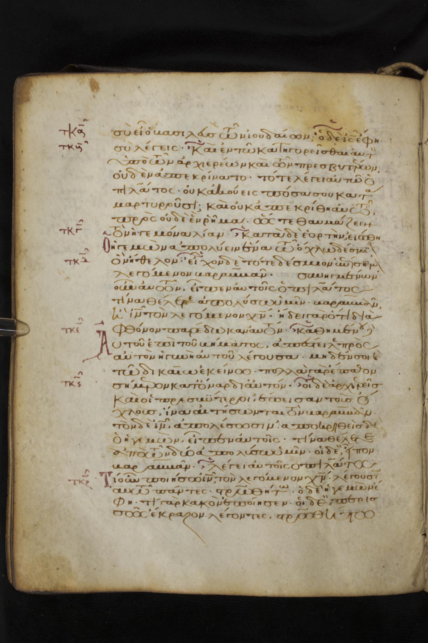 Thirteenth century minuscule of the Gospels on parchment; 172 leaves, 1 column, 20-30 lines per column. Images were taken at the National Library of Greece in Athens.
