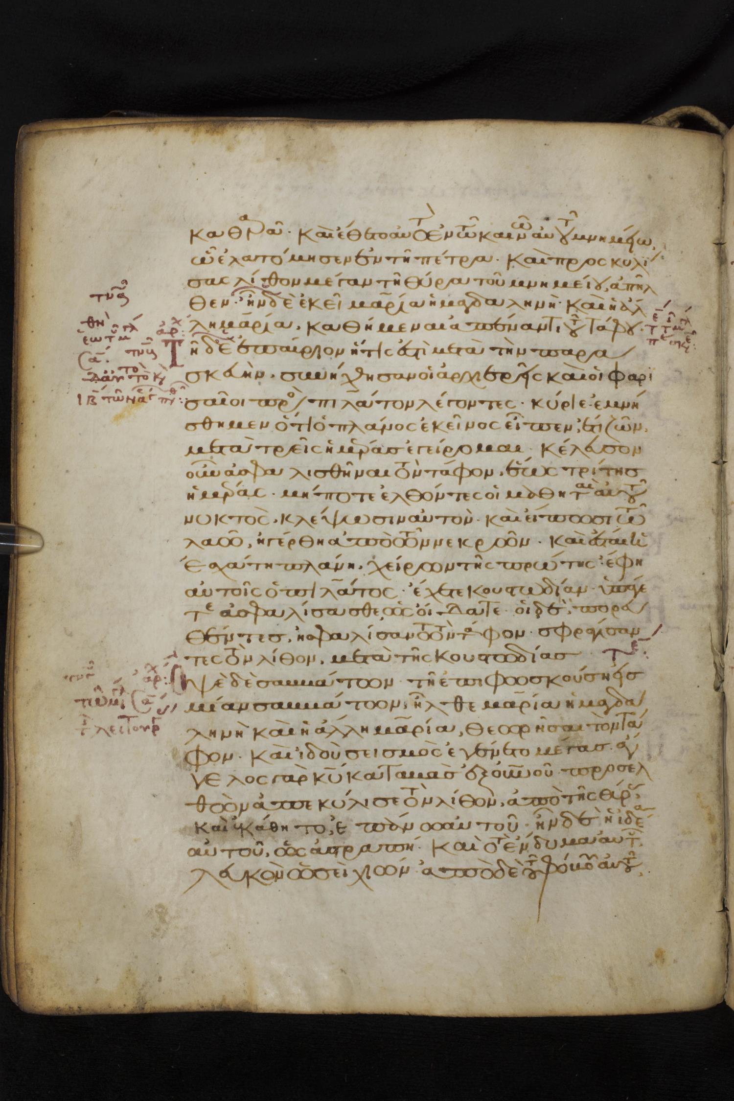 Thirteenth century minuscule of the Gospels on parchment; 172 leaves, 1 column, 20-30 lines per column. Images were taken at the National Library of Greece in Athens.