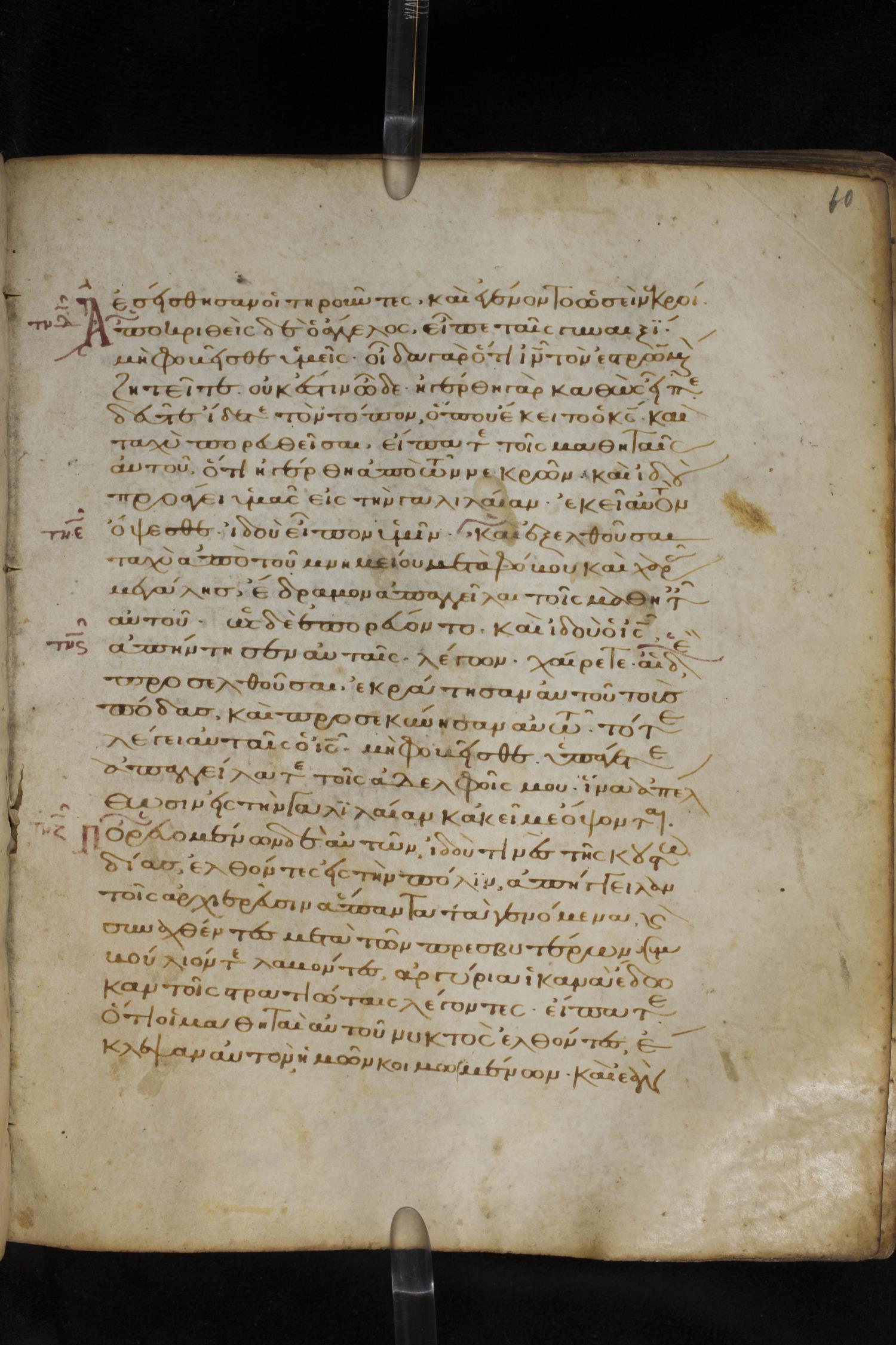 Thirteenth century minuscule of the Gospels on parchment; 172 leaves, 1 column, 20-30 lines per column. Images were taken at the National Library of Greece in Athens.