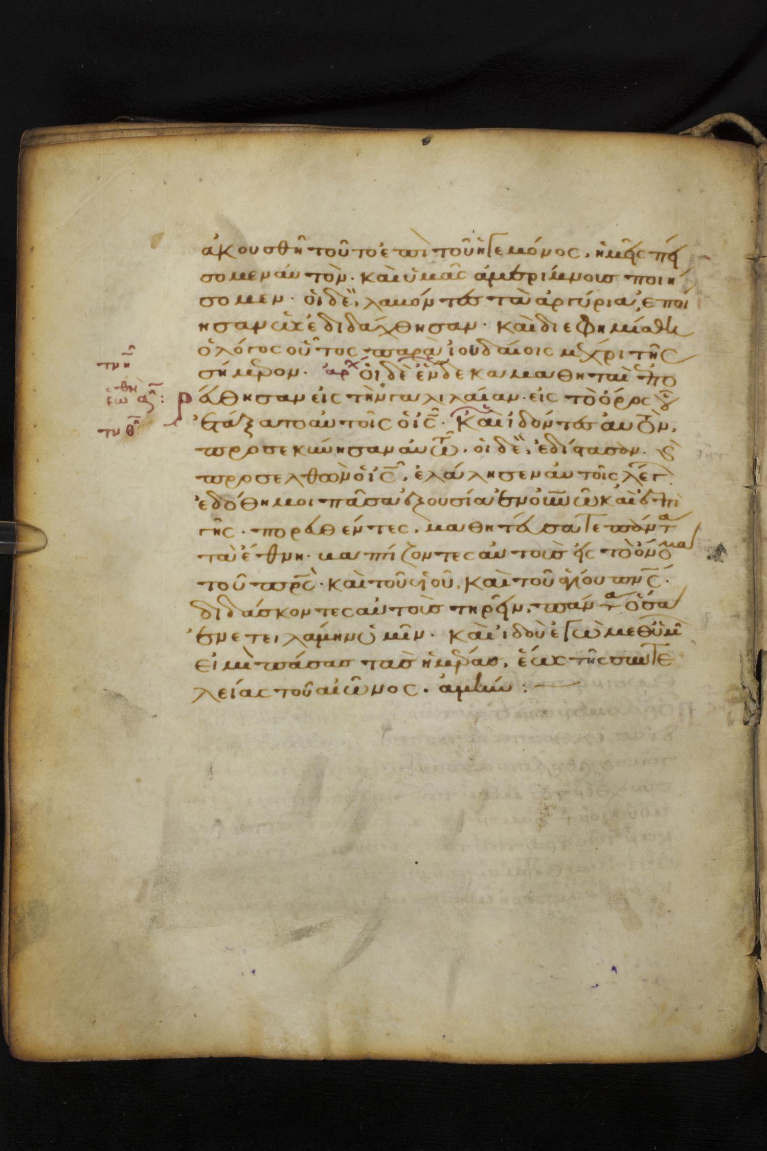 Thirteenth century minuscule of the Gospels on parchment; 172 leaves, 1 column, 20-30 lines per column. Images were taken at the National Library of Greece in Athens.