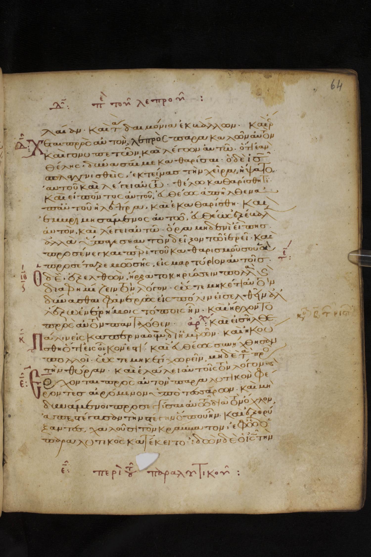 Thirteenth century minuscule of the Gospels on parchment; 172 leaves, 1 column, 20-30 lines per column. Images were taken at the National Library of Greece in Athens.