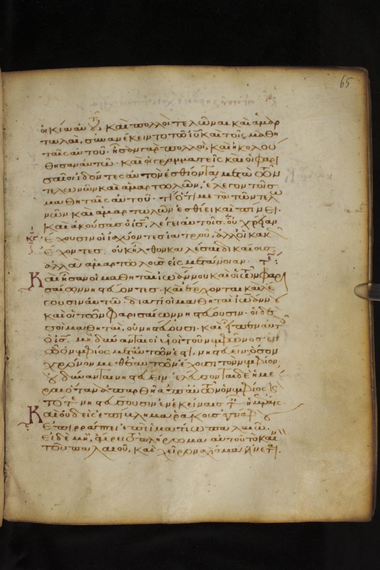 Thirteenth century minuscule of the Gospels on parchment; 172 leaves, 1 column, 20-30 lines per column. Images were taken at the National Library of Greece in Athens.