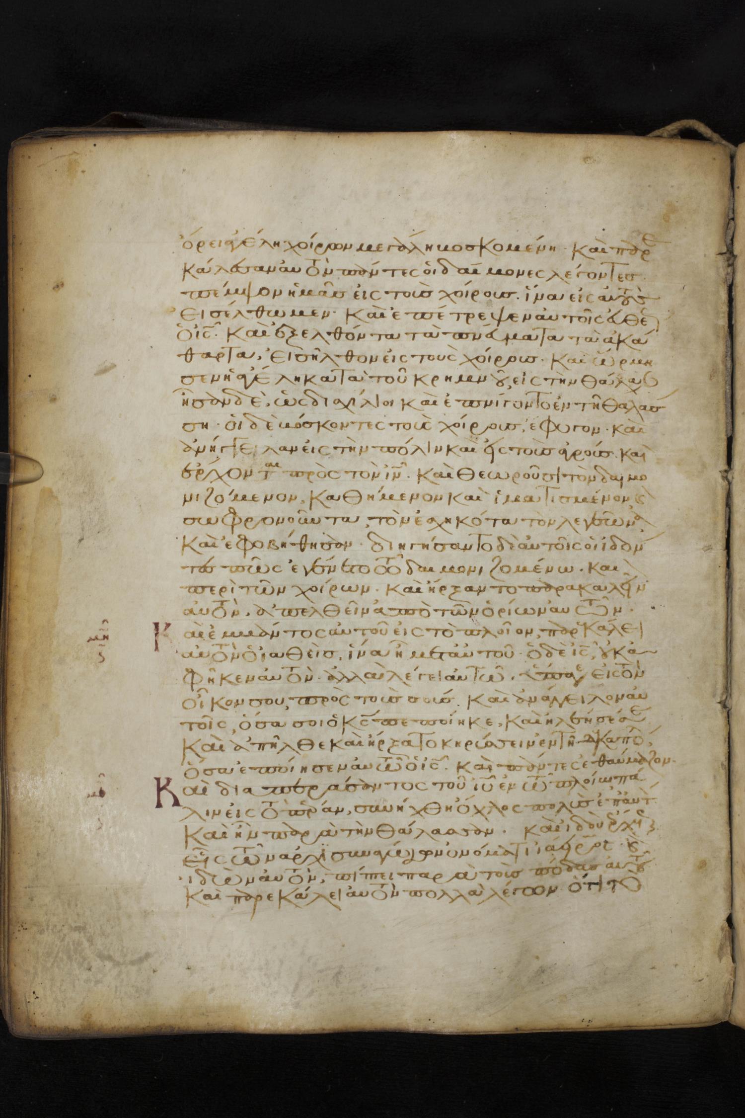 Thirteenth century minuscule of the Gospels on parchment; 172 leaves, 1 column, 20-30 lines per column. Images were taken at the National Library of Greece in Athens.