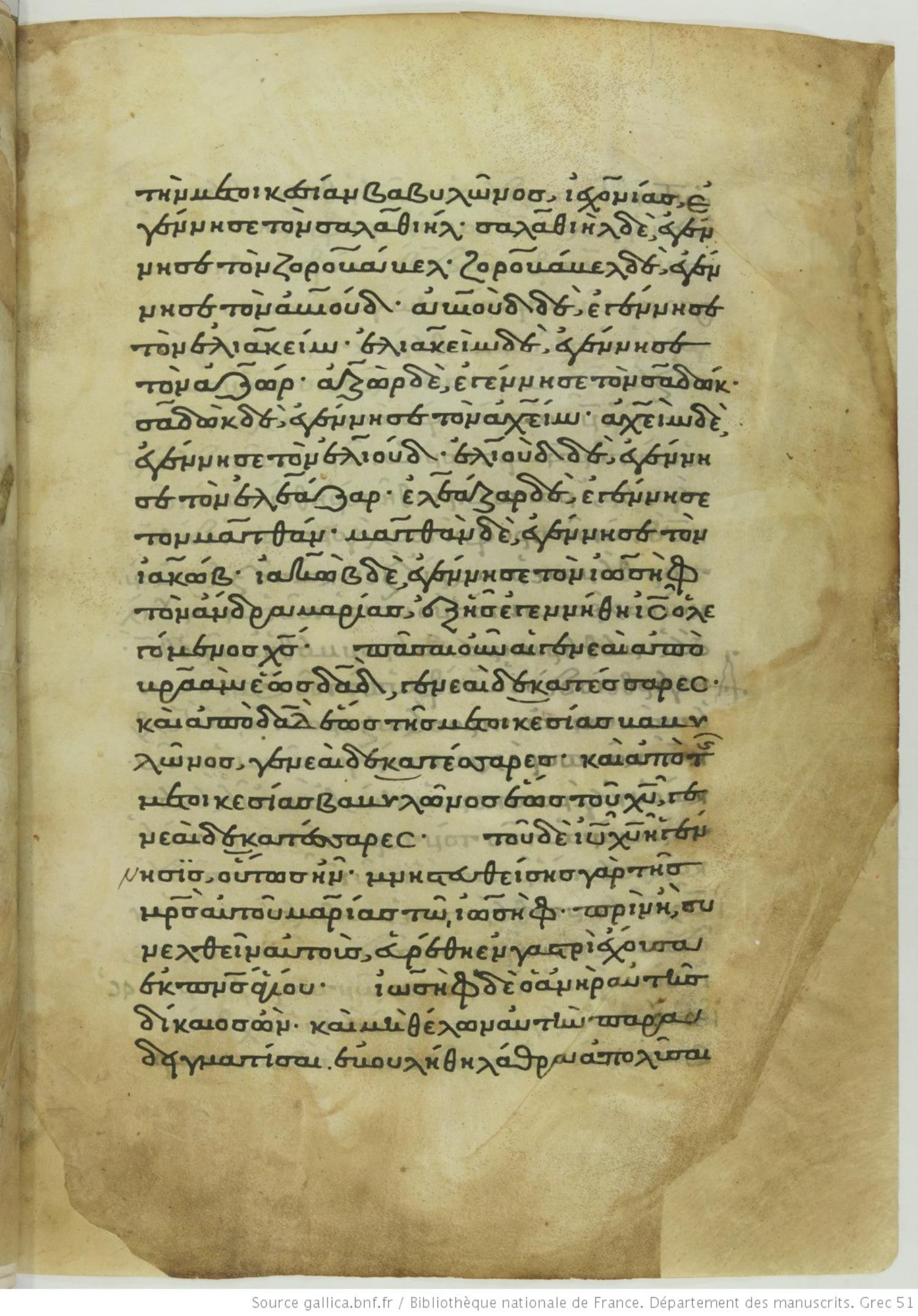 ΤΟΥ ΔΕ ΙΗΣΟΥ ΧΡΙΣΤΟΥ ἡ γένεσις οὕτως ἦν. Μνηστευθείσης τῆς μητρὸς αὐτοῦ Μαρίας τῷ Ἰωσήφ, πρὶν ἢ συνελθεῖν αὐτοὺς εὑρέθη ἐν γαστρὶ ἔχουσα ἐκ πνεύματος ἁγίου.