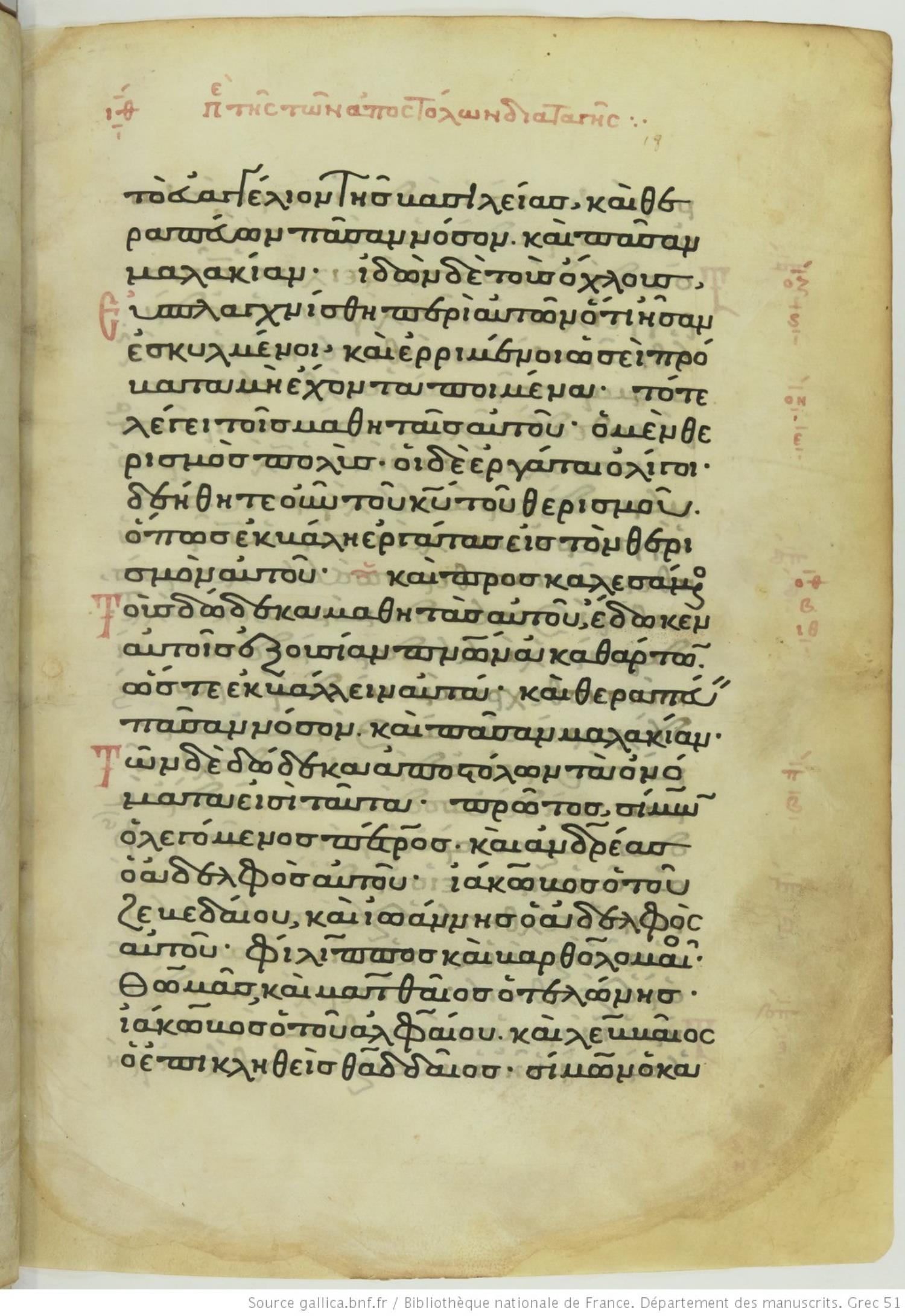 Thirteenth-century minuscule of the Gospels on parchment; 240 leaves; 1 column; 24 lines per column. The images are made available by the Bibliothèque Nationale. For recent digital images, visit BNF Gallica.