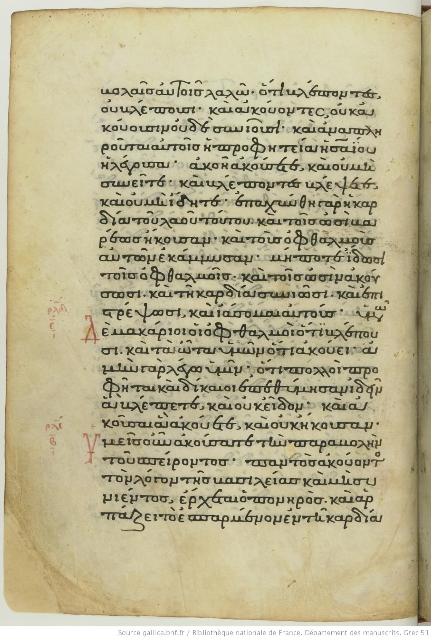 Thirteenth-century minuscule of the Gospels on parchment; 240 leaves; 1 column; 24 lines per column. The images are made available by the Bibliothèque Nationale. For recent digital images, visit BNF Gallica.
