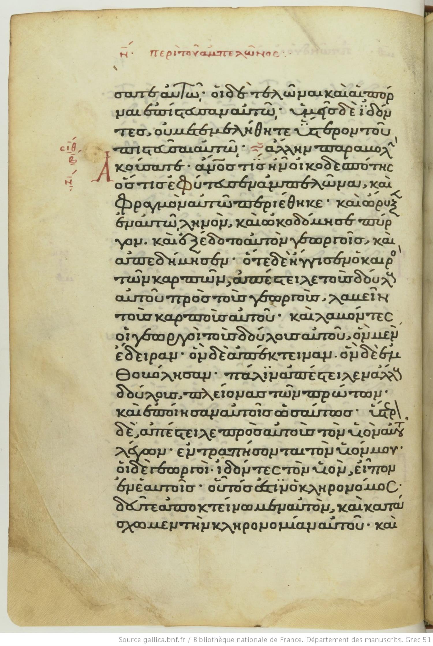 Thirteenth-century minuscule of the Gospels on parchment; 240 leaves; 1 column; 24 lines per column. The images are made available by the Bibliothèque Nationale. For recent digital images, visit BNF Gallica.