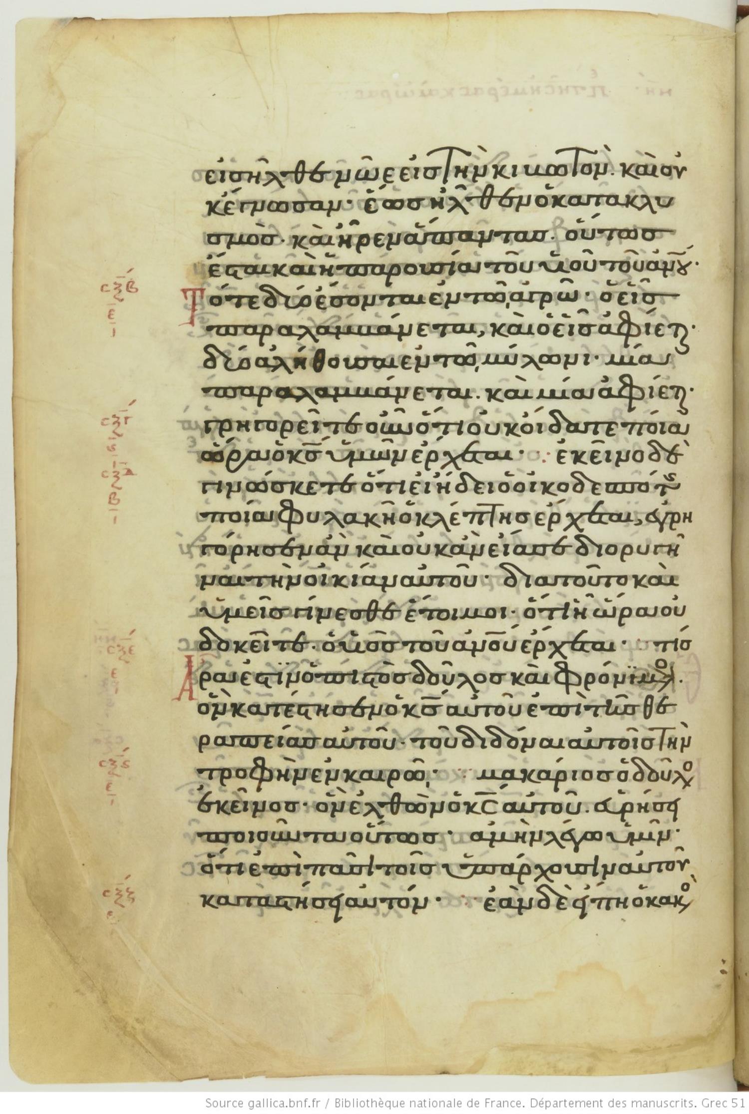 Thirteenth-century minuscule of the Gospels on parchment; 240 leaves; 1 column; 24 lines per column. The images are made available by the Bibliothèque Nationale. For recent digital images, visit BNF Gallica.