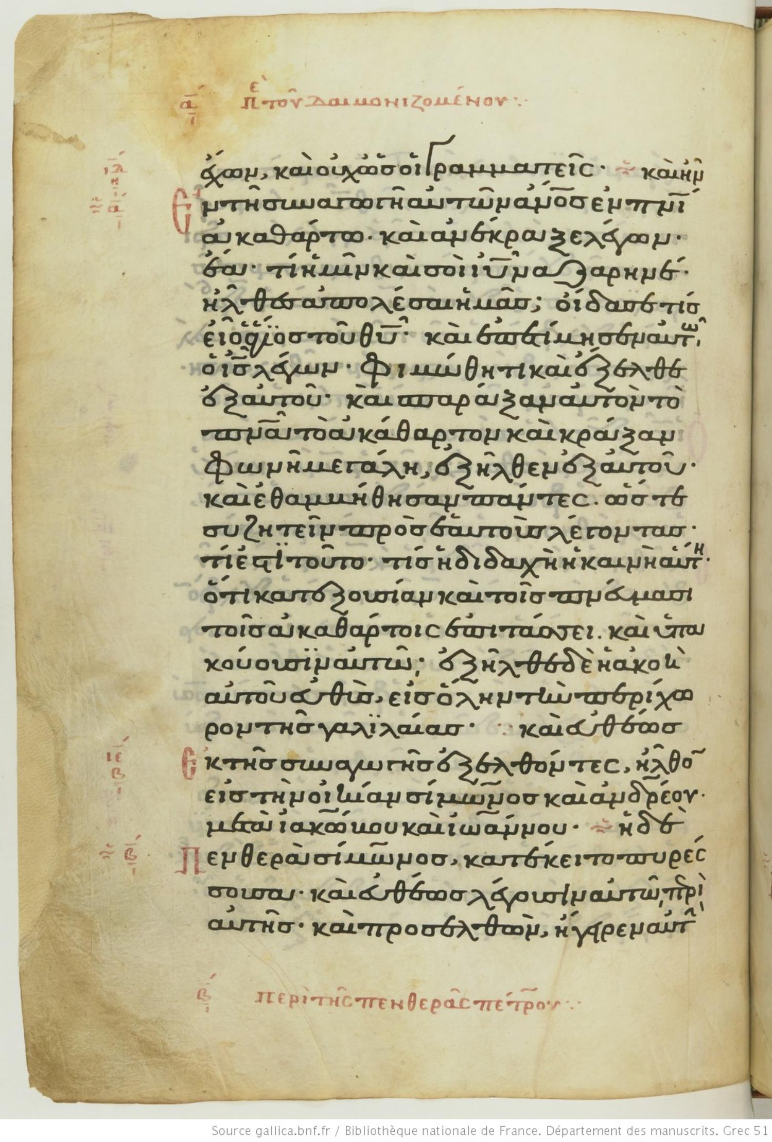 Thirteenth-century minuscule of the Gospels on parchment; 240 leaves; 1 column; 24 lines per column. The images are made available by the Bibliothèque Nationale. For recent digital images, visit BNF Gallica.