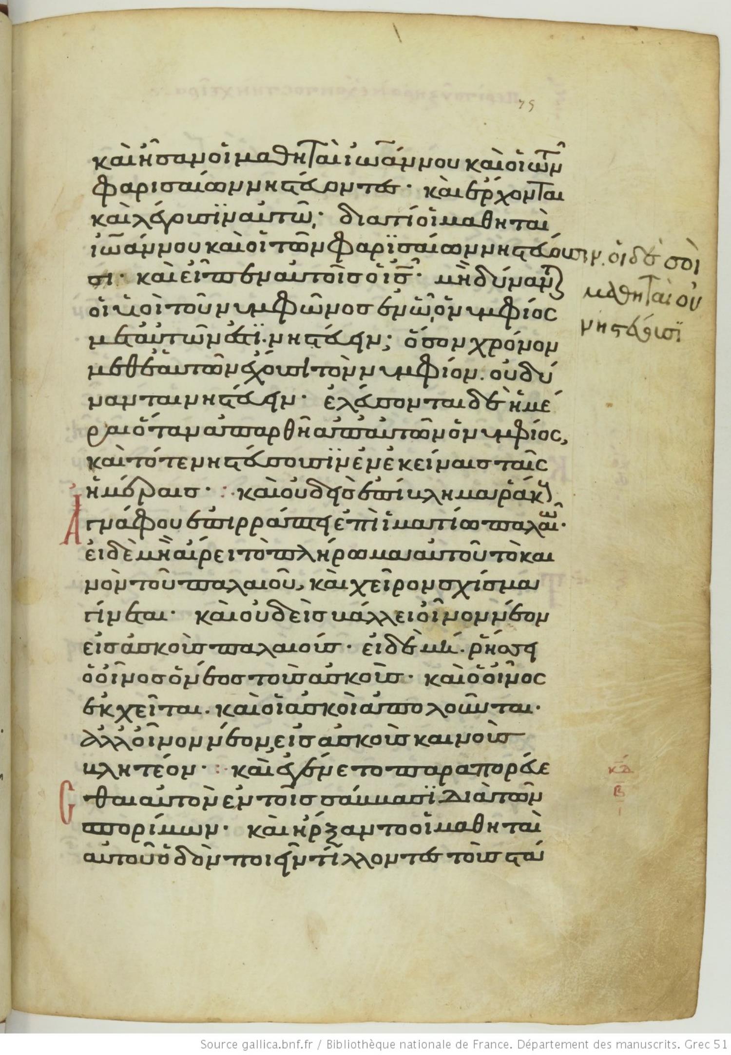 Thirteenth-century minuscule of the Gospels on parchment; 240 leaves; 1 column; 24 lines per column. The images are made available by the Bibliothèque Nationale. For recent digital images, visit BNF Gallica.