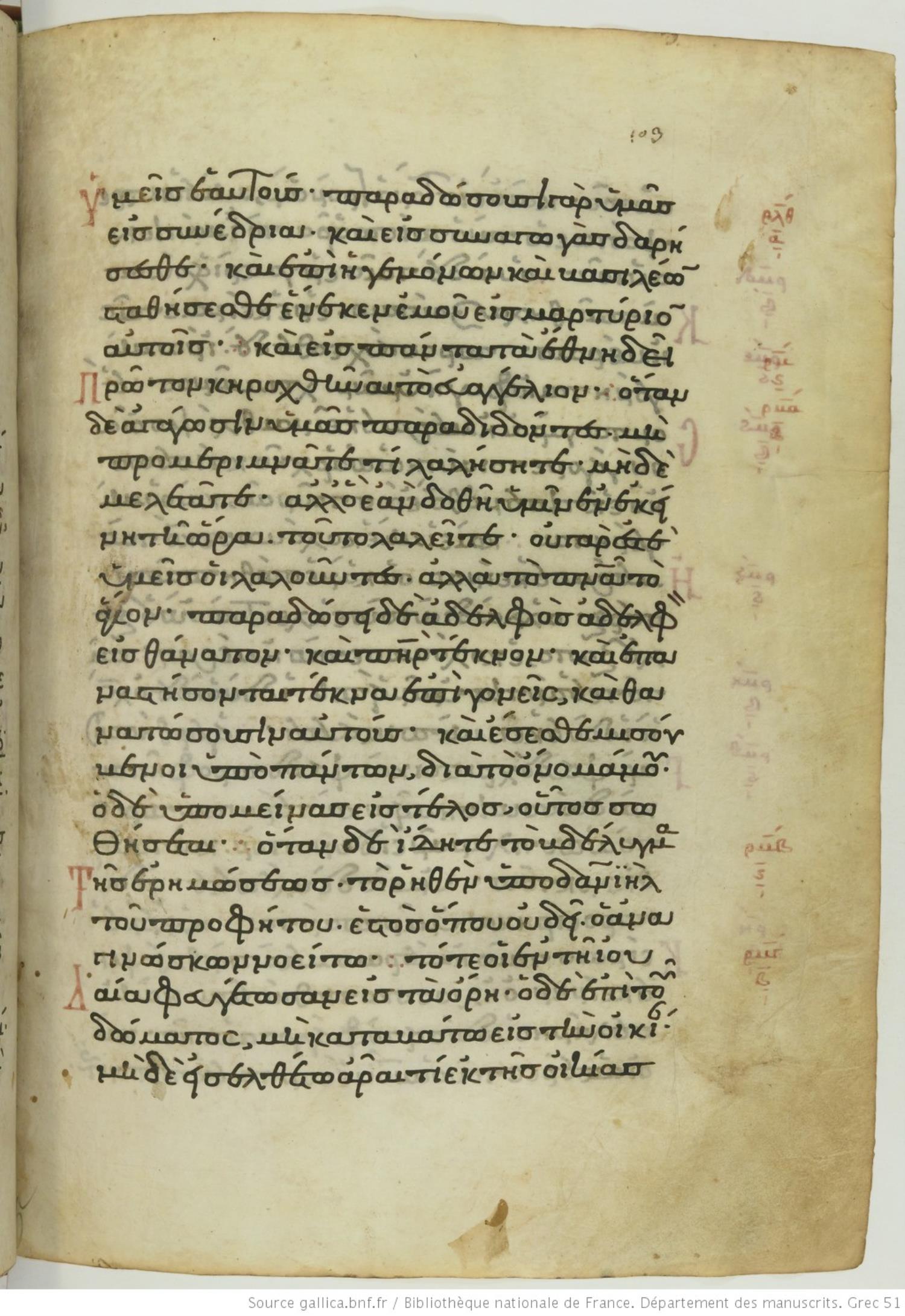 Thirteenth-century minuscule of the Gospels on parchment; 240 leaves; 1 column; 24 lines per column. The images are made available by the Bibliothèque Nationale. For recent digital images, visit BNF Gallica.