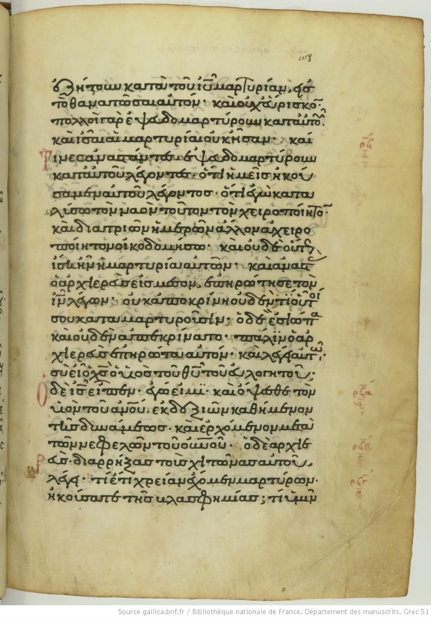 Thirteenth-century minuscule of the Gospels on parchment; 240 leaves; 1 column; 24 lines per column. The images are made available by the Bibliothèque Nationale. For recent digital images, visit BNF Gallica.
