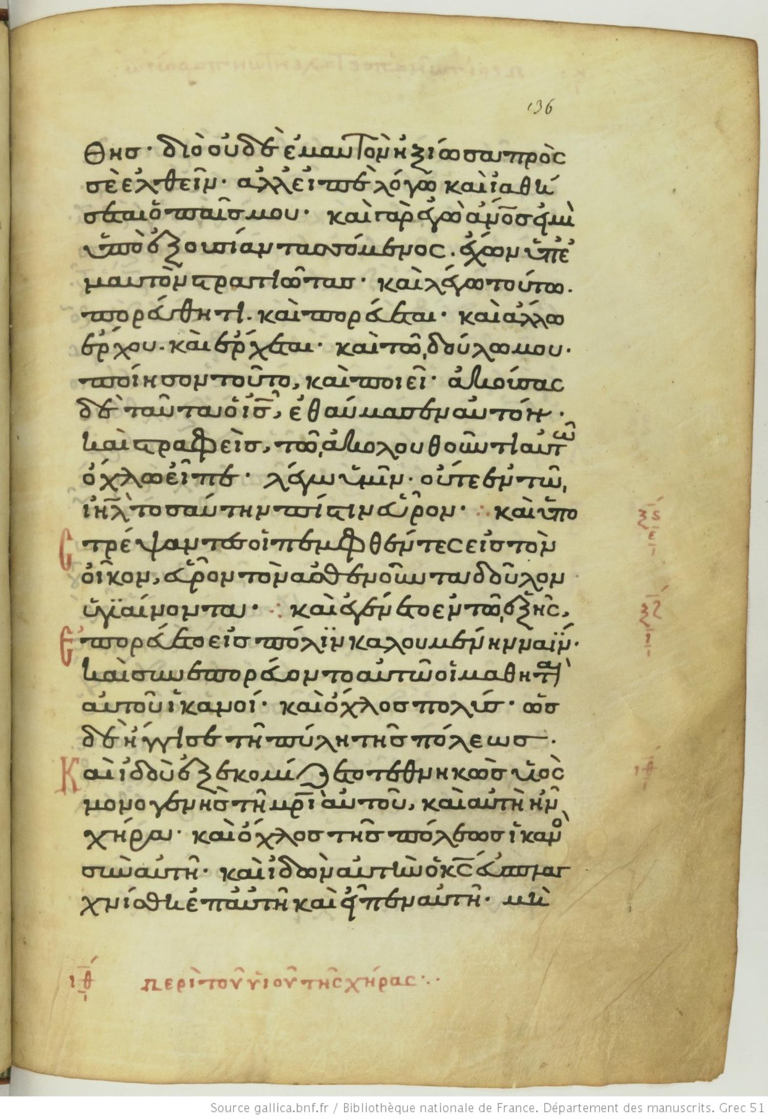 Thirteenth-century minuscule of the Gospels on parchment; 240 leaves; 1 column; 24 lines per column. The images are made available by the Bibliothèque Nationale. For recent digital images, visit BNF Gallica.