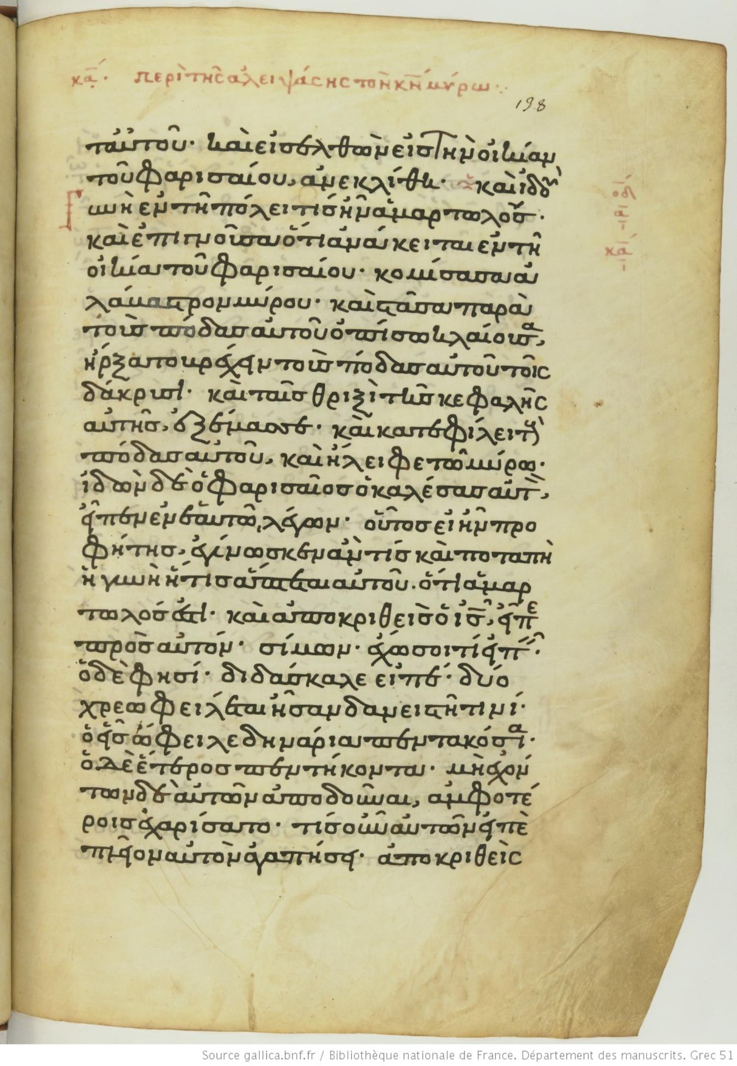 Thirteenth-century minuscule of the Gospels on parchment; 240 leaves; 1 column; 24 lines per column. The images are made available by the Bibliothèque Nationale. For recent digital images, visit BNF Gallica.