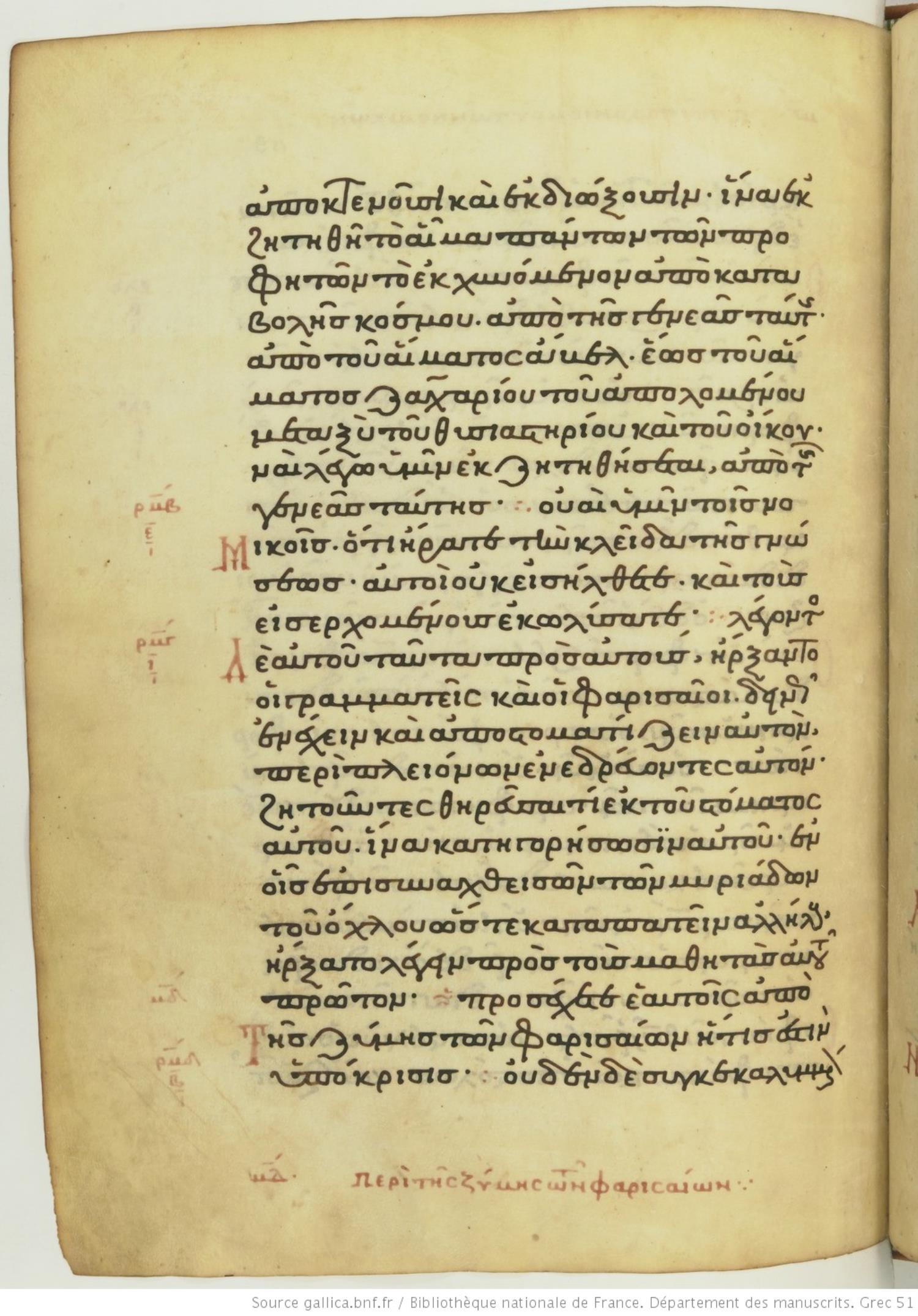 Thirteenth-century minuscule of the Gospels on parchment; 240 leaves; 1 column; 24 lines per column. The images are made available by the Bibliothèque Nationale. For recent digital images, visit BNF Gallica.
