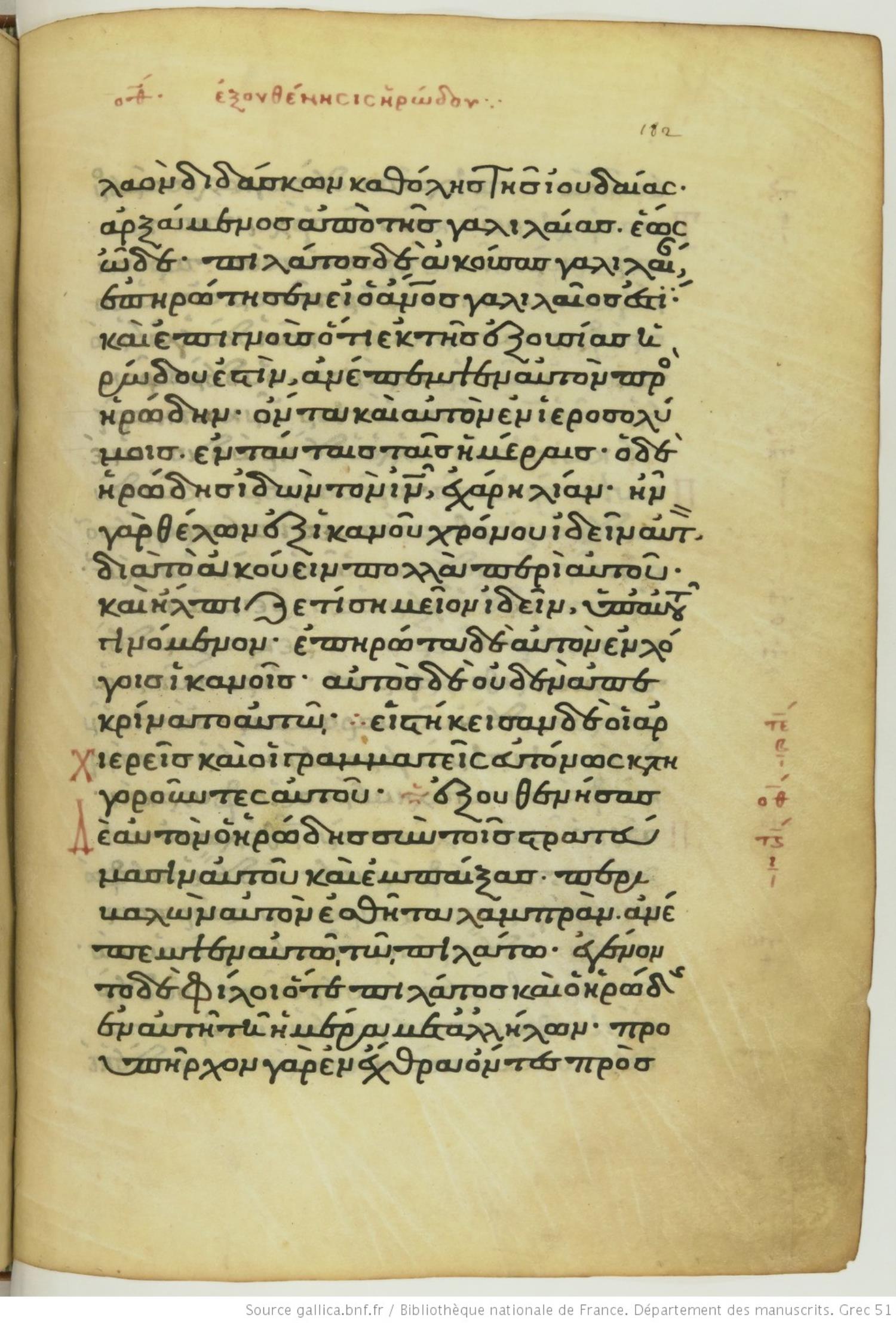 Thirteenth-century minuscule of the Gospels on parchment; 240 leaves; 1 column; 24 lines per column. The images are made available by the Bibliothèque Nationale. For recent digital images, visit BNF Gallica.