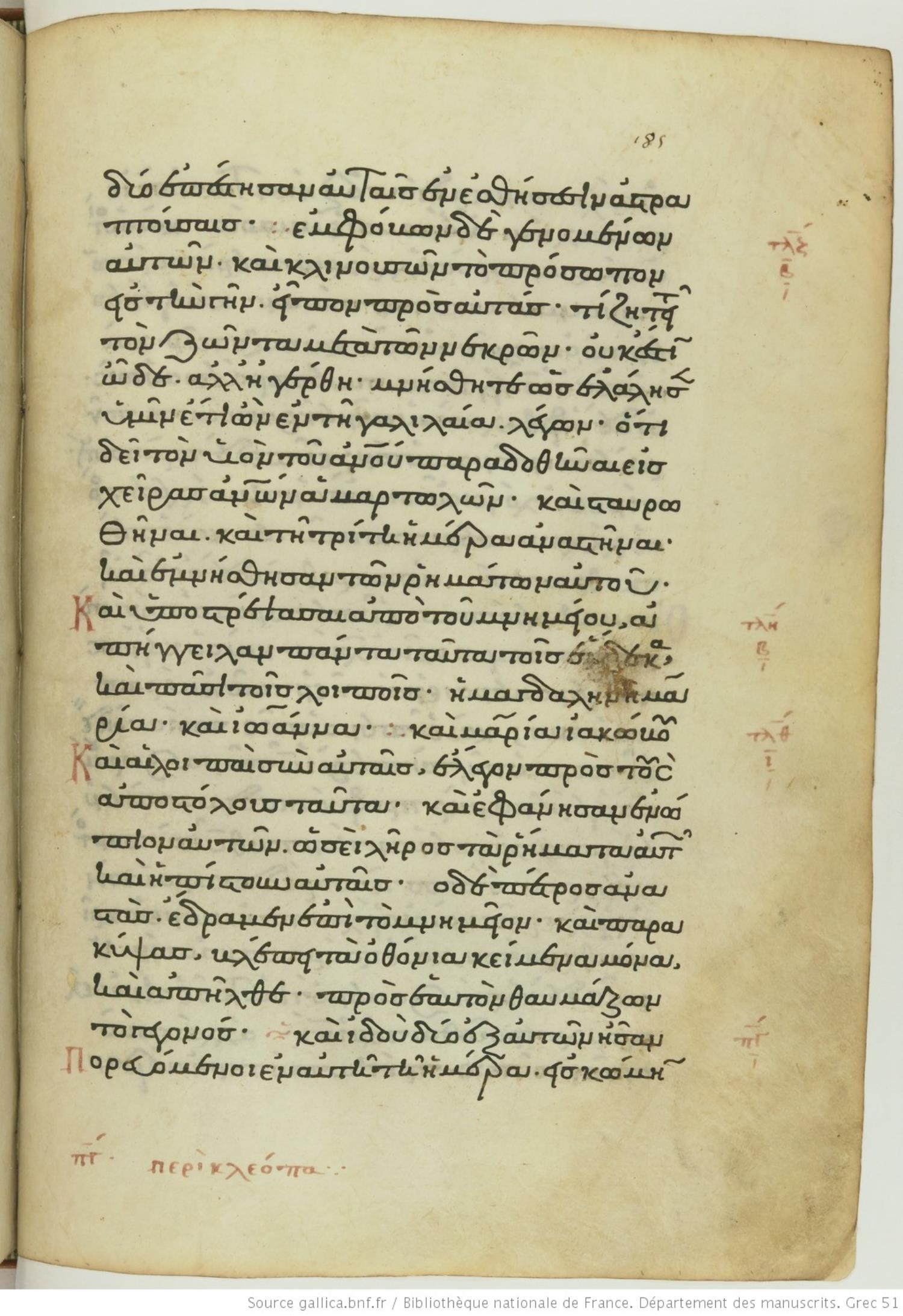 Thirteenth-century minuscule of the Gospels on parchment; 240 leaves; 1 column; 24 lines per column. The images are made available by the Bibliothèque Nationale. For recent digital images, visit BNF Gallica.