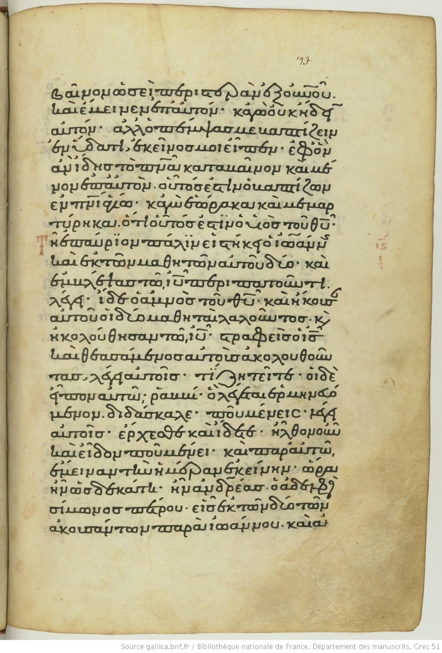 Thirteenth-century minuscule of the Gospels on parchment; 240 leaves; 1 column; 24 lines per column. The images are made available by the Bibliothèque Nationale. For recent digital images, visit BNF Gallica.