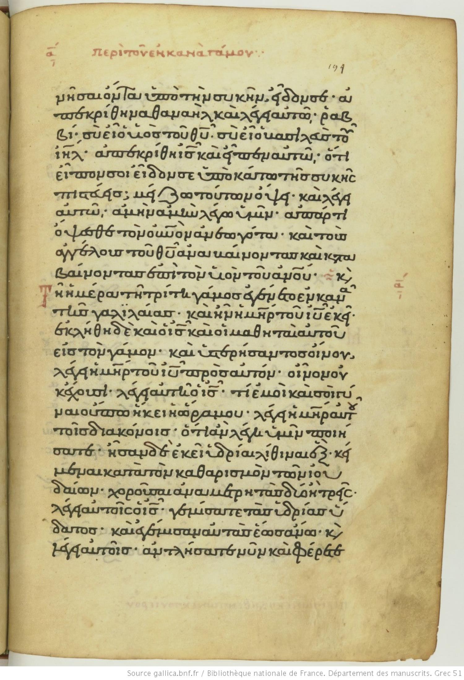 Thirteenth-century minuscule of the Gospels on parchment; 240 leaves; 1 column; 24 lines per column. The images are made available by the Bibliothèque Nationale. For recent digital images, visit BNF Gallica.