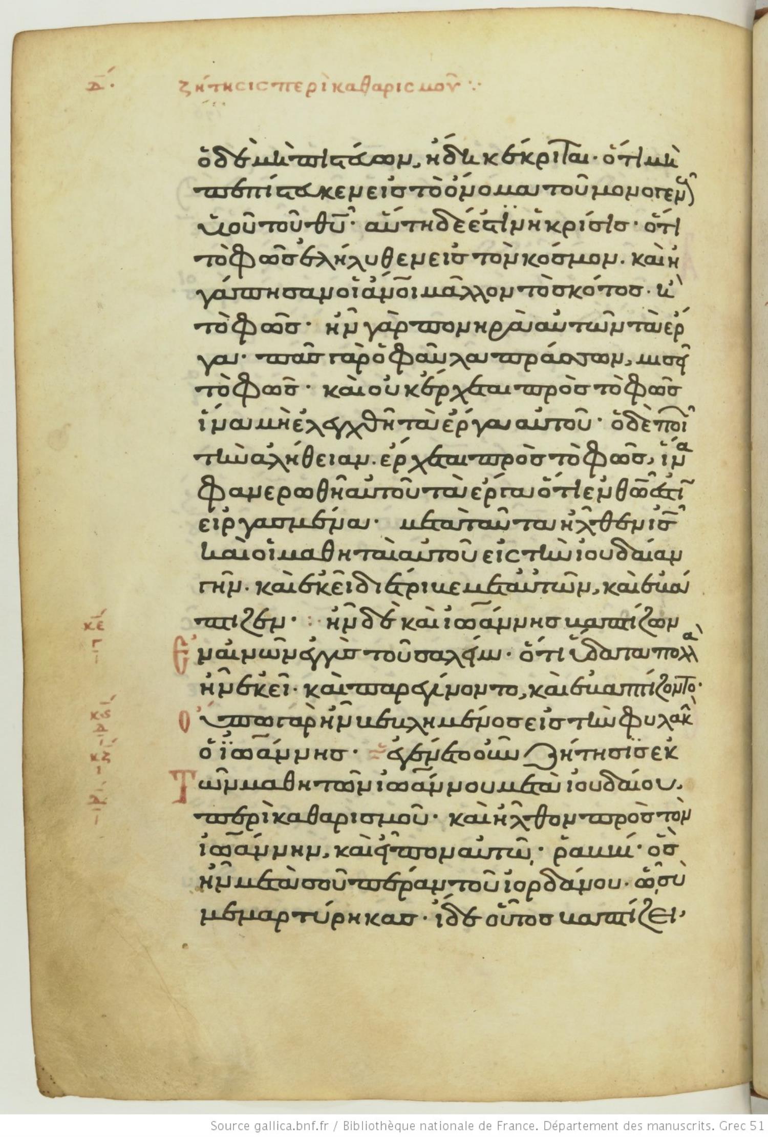 Thirteenth-century minuscule of the Gospels on parchment; 240 leaves; 1 column; 24 lines per column. The images are made available by the Bibliothèque Nationale. For recent digital images, visit BNF Gallica.