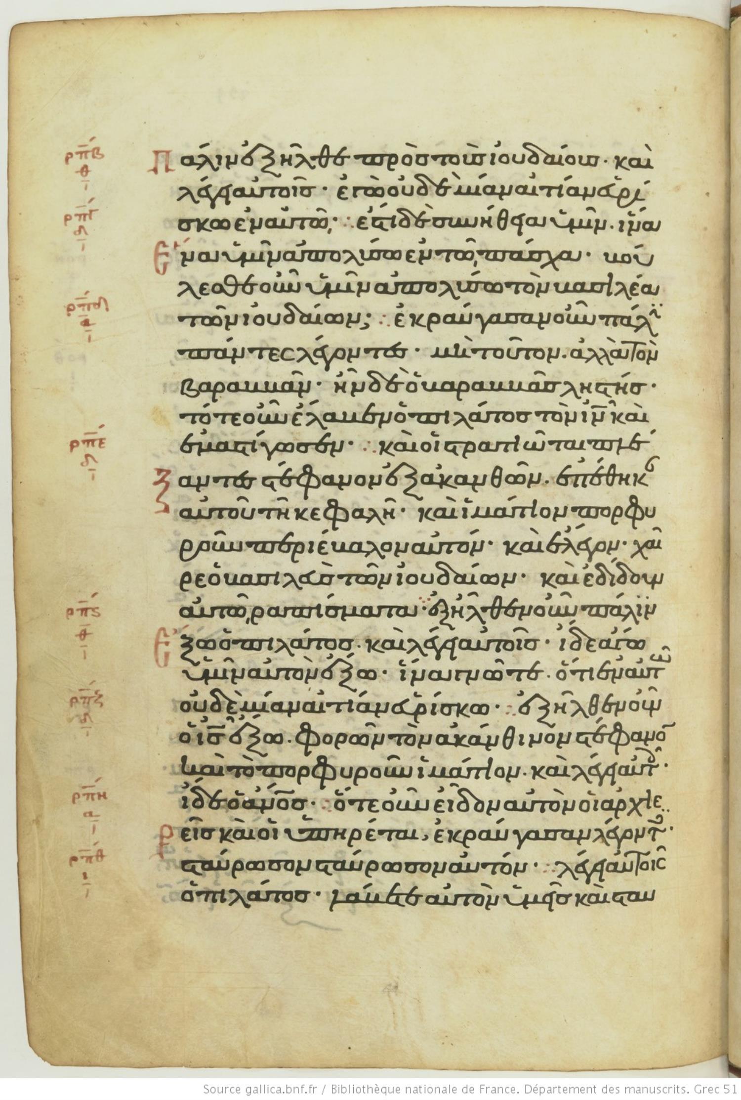 Thirteenth-century minuscule of the Gospels on parchment; 240 leaves; 1 column; 24 lines per column. The images are made available by the Bibliothèque Nationale. For recent digital images, visit BNF Gallica.