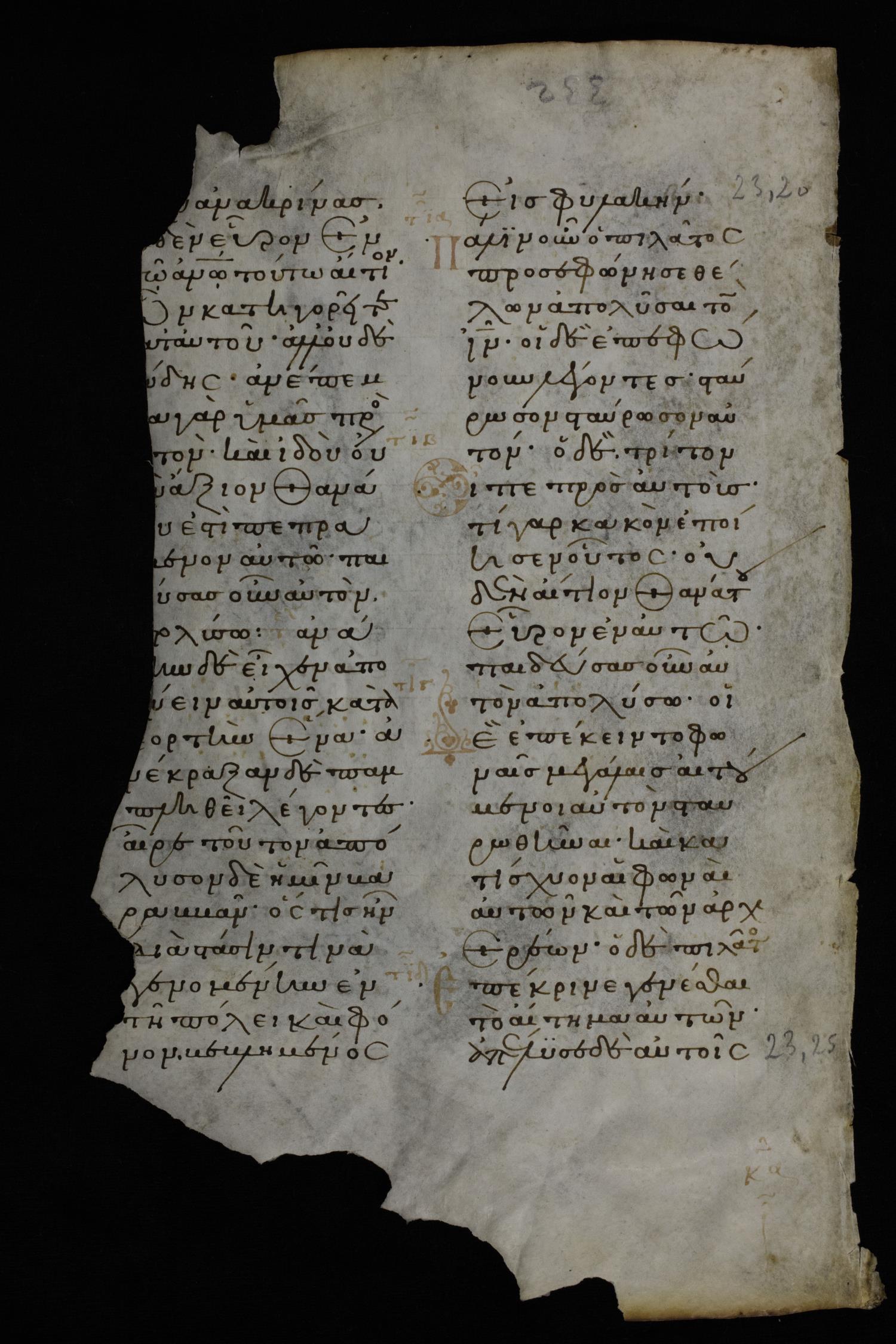 Twelfth century minuscule of the Gospels on parchment; 1 leaf, 2 columns, 25 lines per column. CSNTM digitized this manuscript in partnership with Houston Baptist University in 2019.