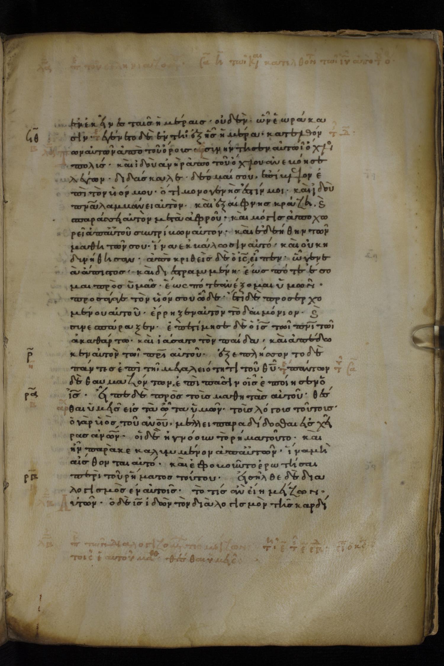 Tenth or eleventh century minuscule of the Gospels on parchment; 46 leaves, single column, 29 lines per column.
