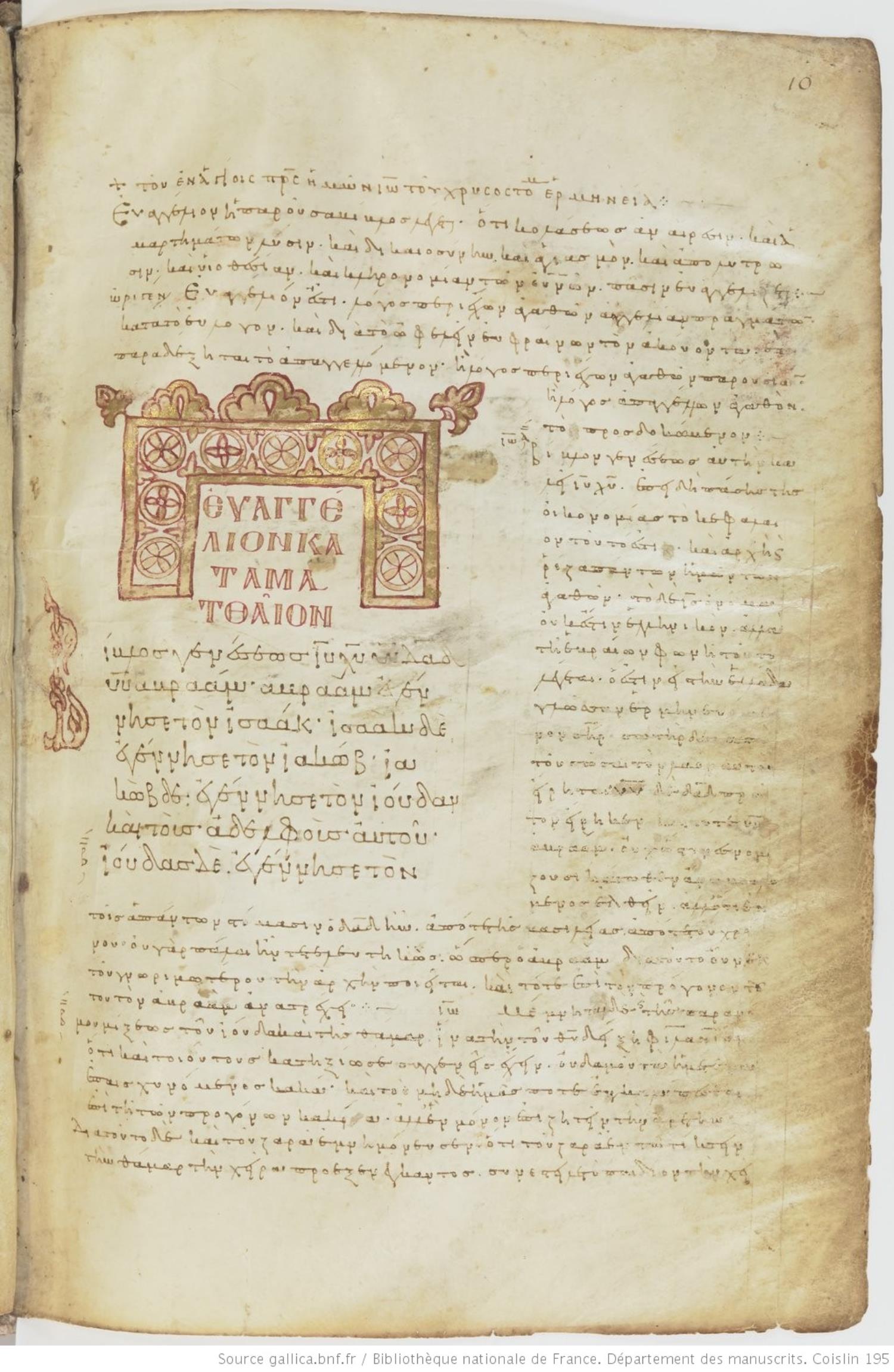 Tenth-century minuscule of the Gospels with commentary on parchment; 469 leaves, 1 column, varying number of lines per column. Images are made available by the Bilbiothèque Nationale. For recent images, please visit BNF Gallica.