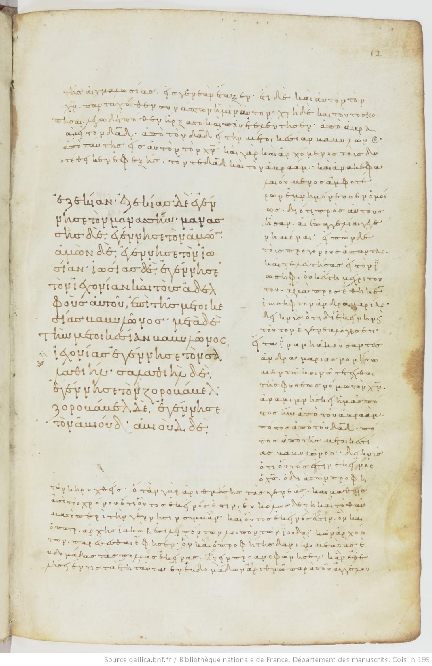 Tenth-century minuscule of the Gospels with commentary on parchment; 469 leaves, 1 column, varying number of lines per column. Images are made available by the Bilbiothèque Nationale. For recent images, please visit BNF Gallica.