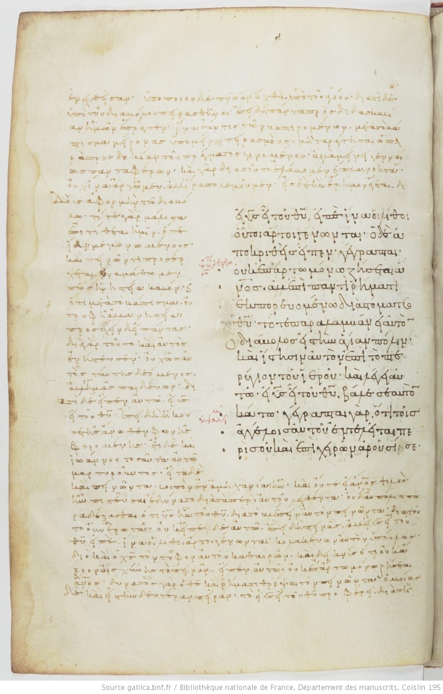 Tenth-century minuscule of the Gospels with commentary on parchment; 469 leaves, 1 column, varying number of lines per column. Images are made available by the Bilbiothèque Nationale. For recent images, please visit BNF Gallica.
