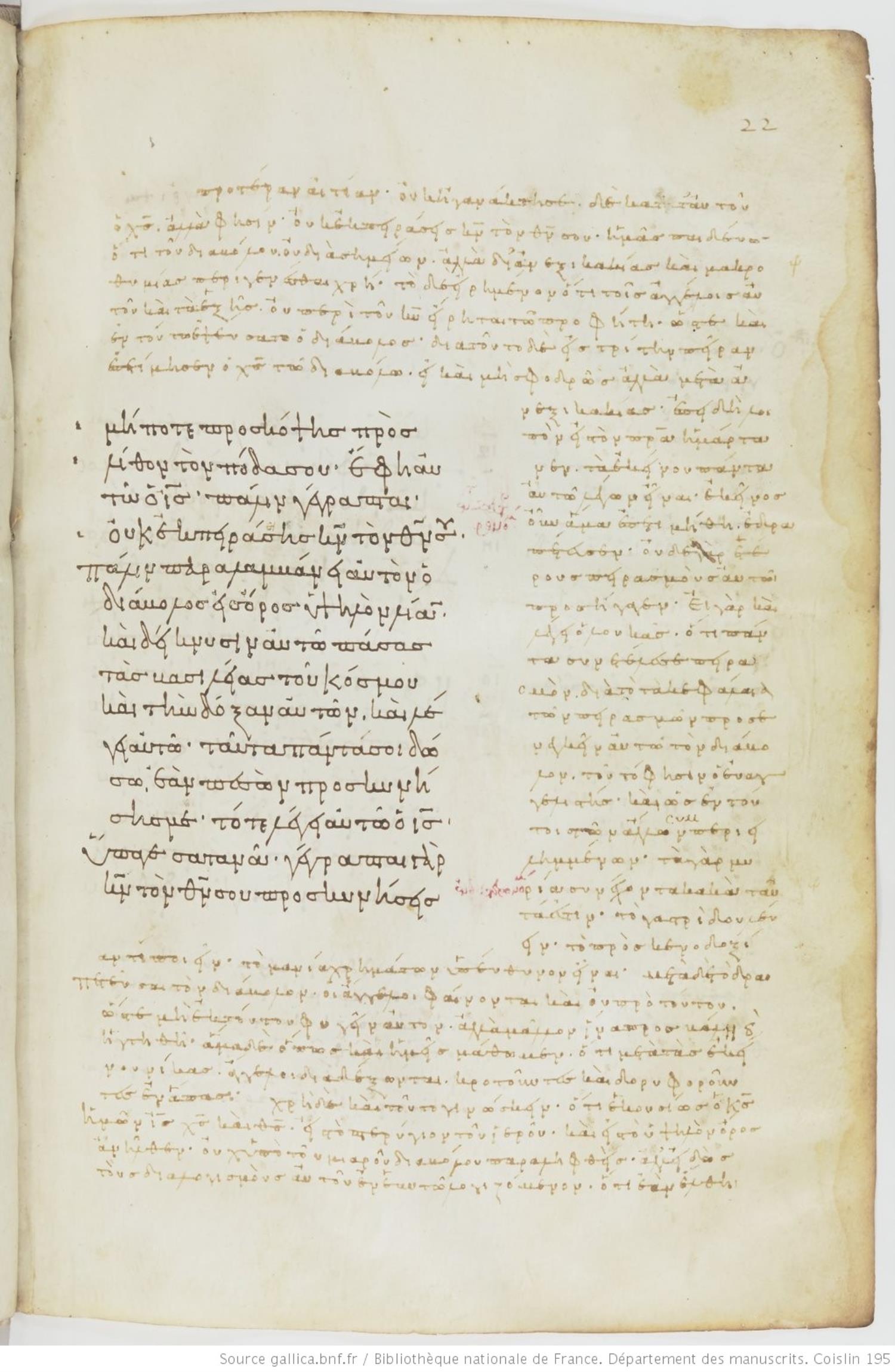Tenth-century minuscule of the Gospels with commentary on parchment; 469 leaves, 1 column, varying number of lines per column. Images are made available by the Bilbiothèque Nationale. For recent images, please visit BNF Gallica.