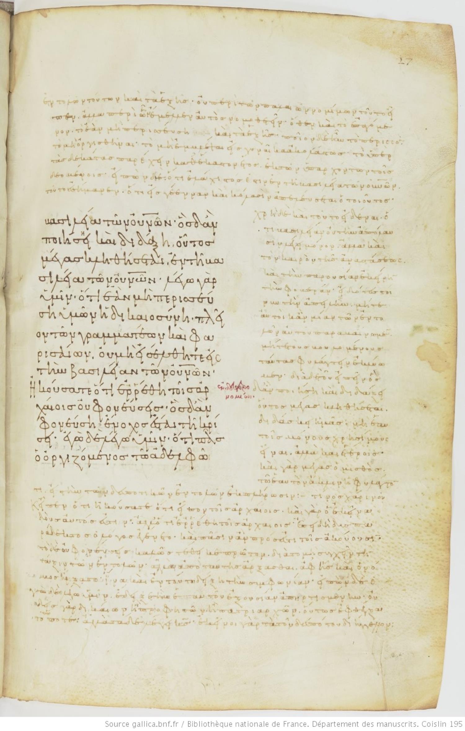 Tenth-century minuscule of the Gospels with commentary on parchment; 469 leaves, 1 column, varying number of lines per column. Images are made available by the Bilbiothèque Nationale. For recent images, please visit BNF Gallica.