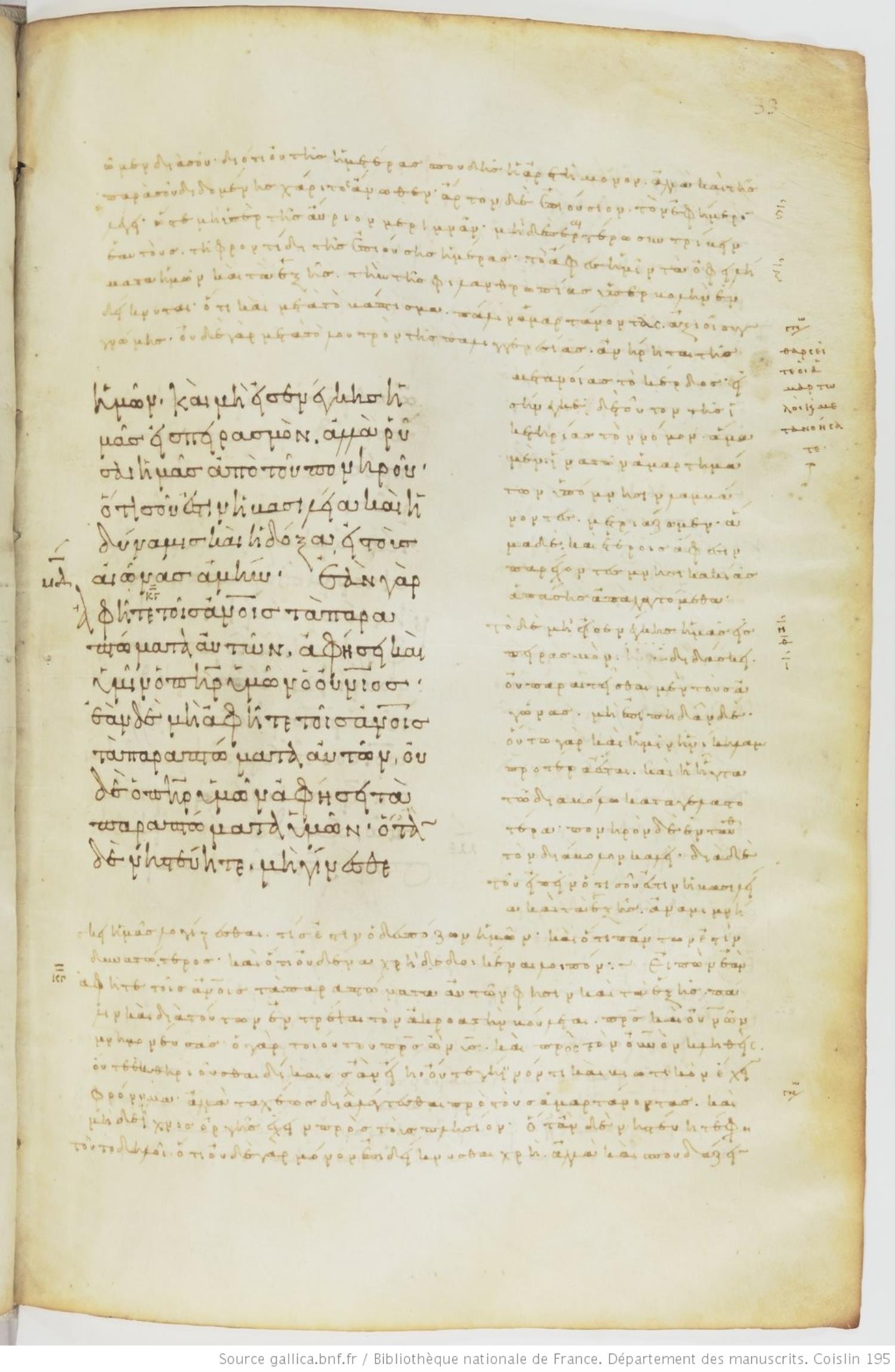 Tenth-century minuscule of the Gospels with commentary on parchment; 469 leaves, 1 column, varying number of lines per column. Images are made available by the Bilbiothèque Nationale. For recent images, please visit BNF Gallica.