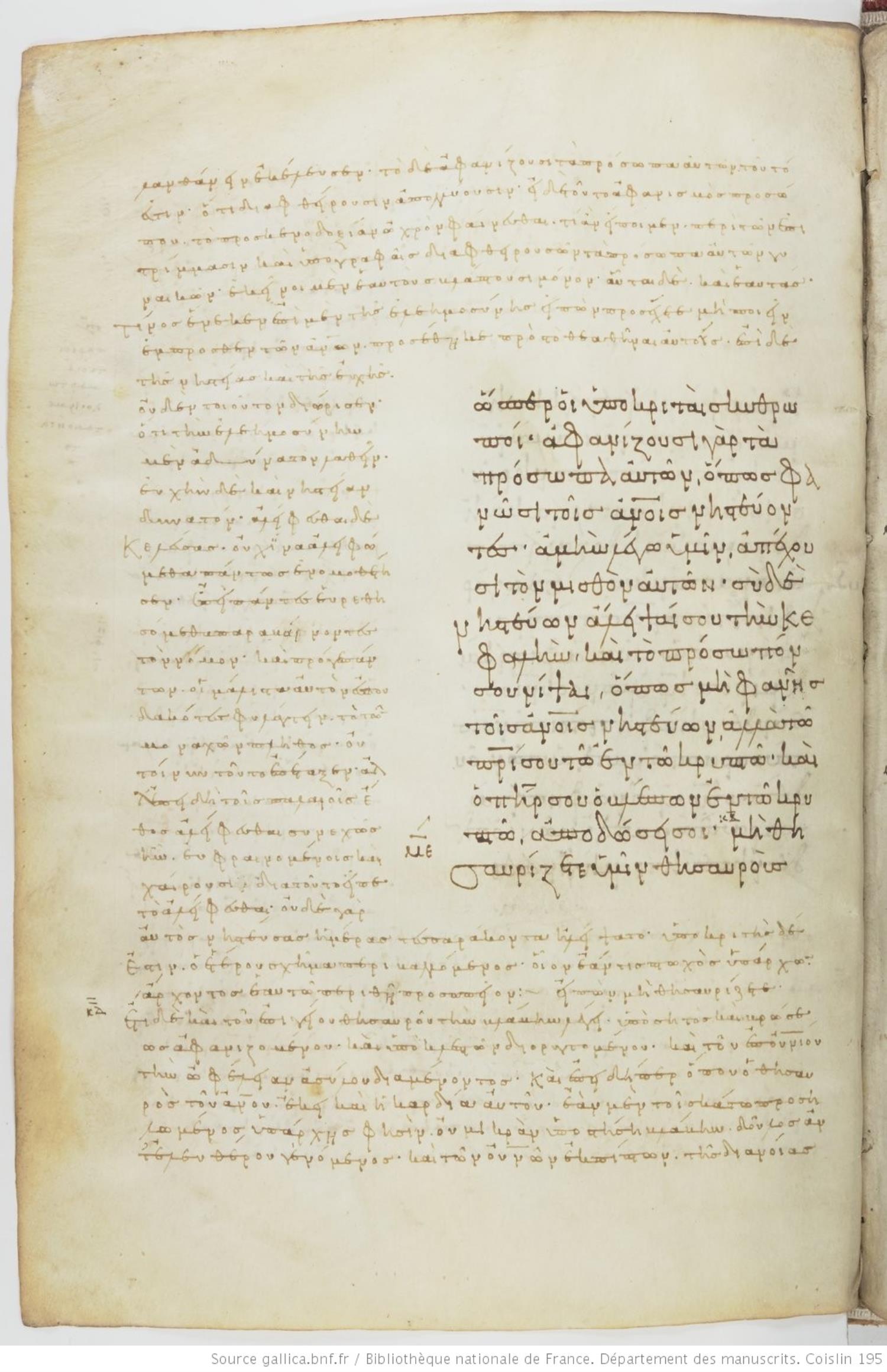 Tenth-century minuscule of the Gospels with commentary on parchment; 469 leaves, 1 column, varying number of lines per column. Images are made available by the Bilbiothèque Nationale. For recent images, please visit BNF Gallica.