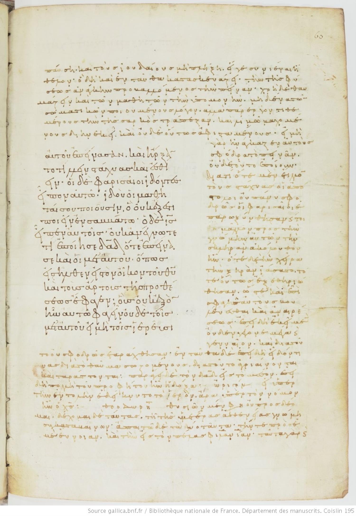 Tenth-century minuscule of the Gospels with commentary on parchment; 469 leaves, 1 column, varying number of lines per column. Images are made available by the Bilbiothèque Nationale. For recent images, please visit BNF Gallica.
