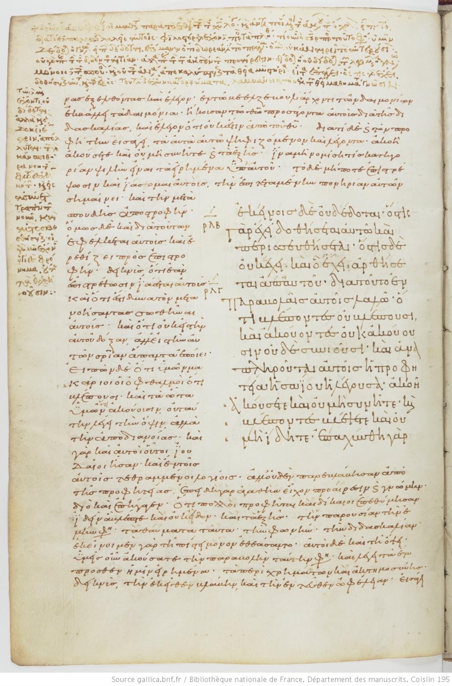 Tenth-century minuscule of the Gospels with commentary on parchment; 469 leaves, 1 column, varying number of lines per column. Images are made available by the Bilbiothèque Nationale. For recent images, please visit BNF Gallica.