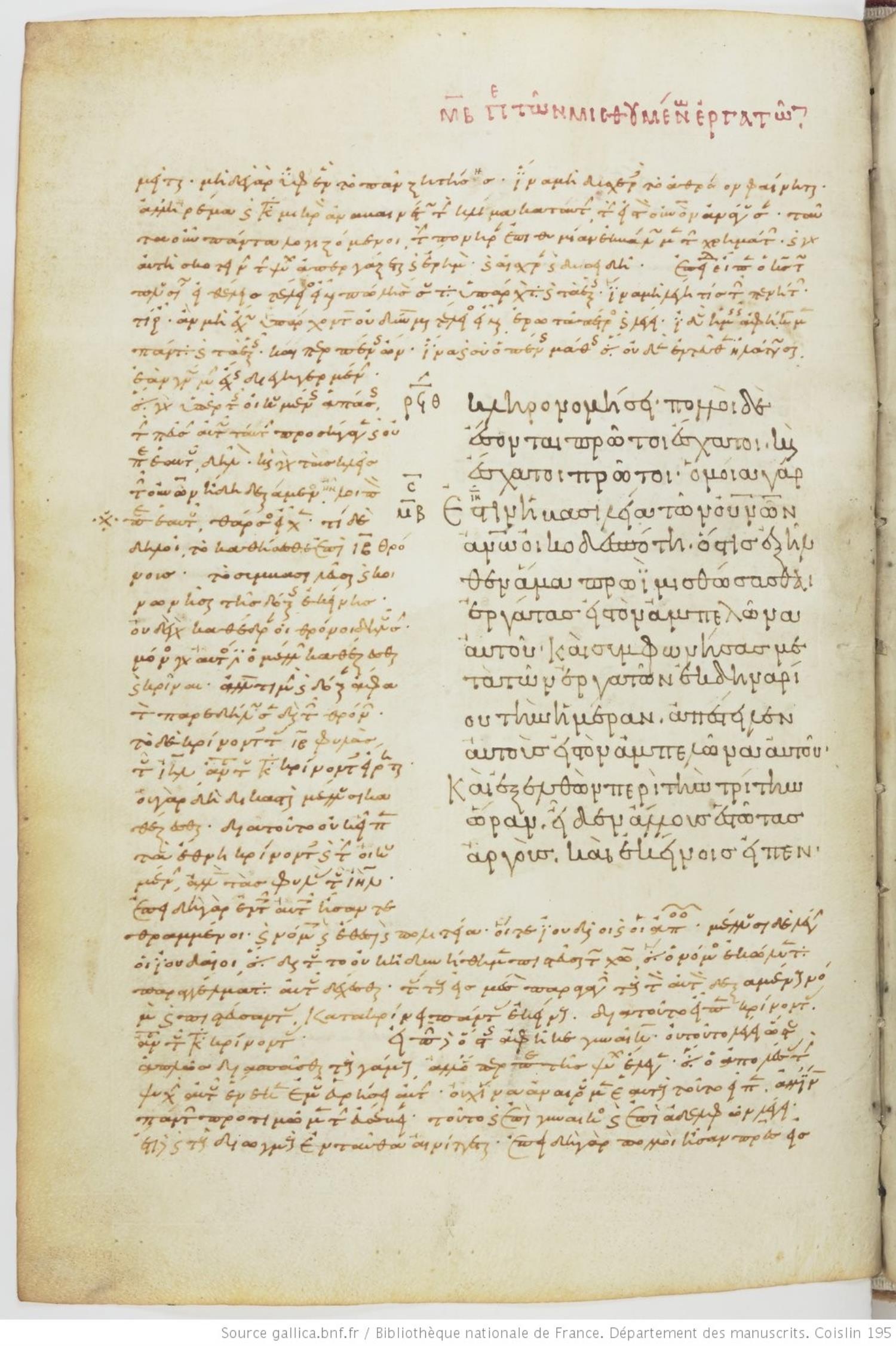 Tenth-century minuscule of the Gospels with commentary on parchment; 469 leaves, 1 column, varying number of lines per column. Images are made available by the Bilbiothèque Nationale. For recent images, please visit BNF Gallica.
