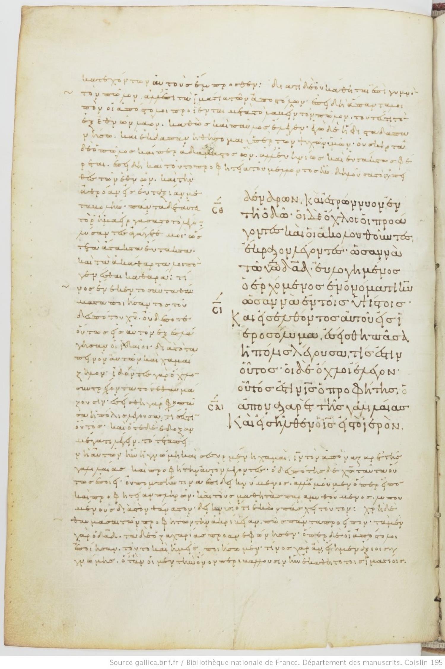 Tenth-century minuscule of the Gospels with commentary on parchment; 469 leaves, 1 column, varying number of lines per column. Images are made available by the Bilbiothèque Nationale. For recent images, please visit BNF Gallica.