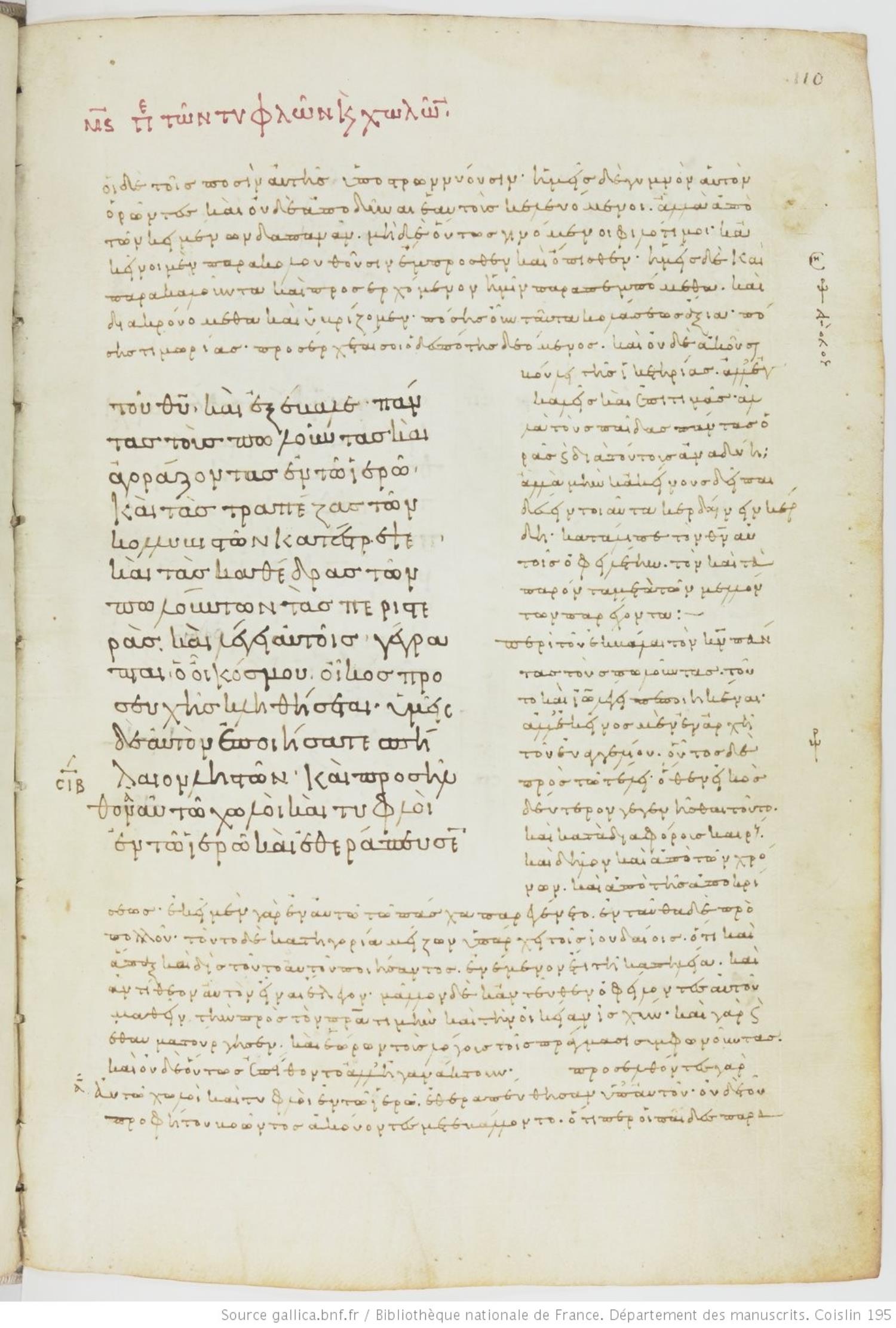 Tenth-century minuscule of the Gospels with commentary on parchment; 469 leaves, 1 column, varying number of lines per column. Images are made available by the Bilbiothèque Nationale. For recent images, please visit BNF Gallica.