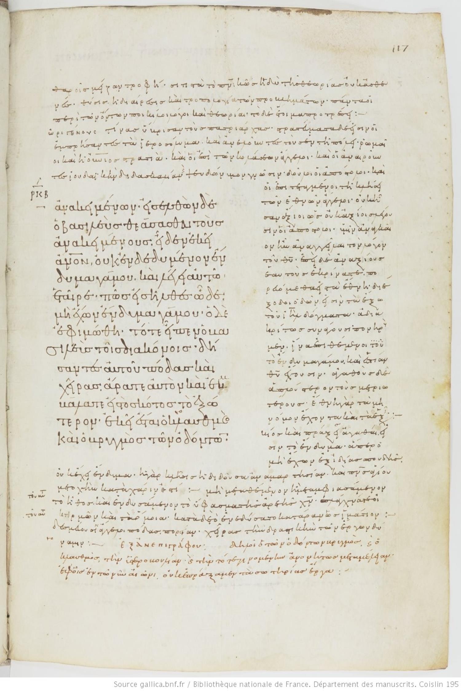 Tenth-century minuscule of the Gospels with commentary on parchment; 469 leaves, 1 column, varying number of lines per column. Images are made available by the Bilbiothèque Nationale. For recent images, please visit BNF Gallica.