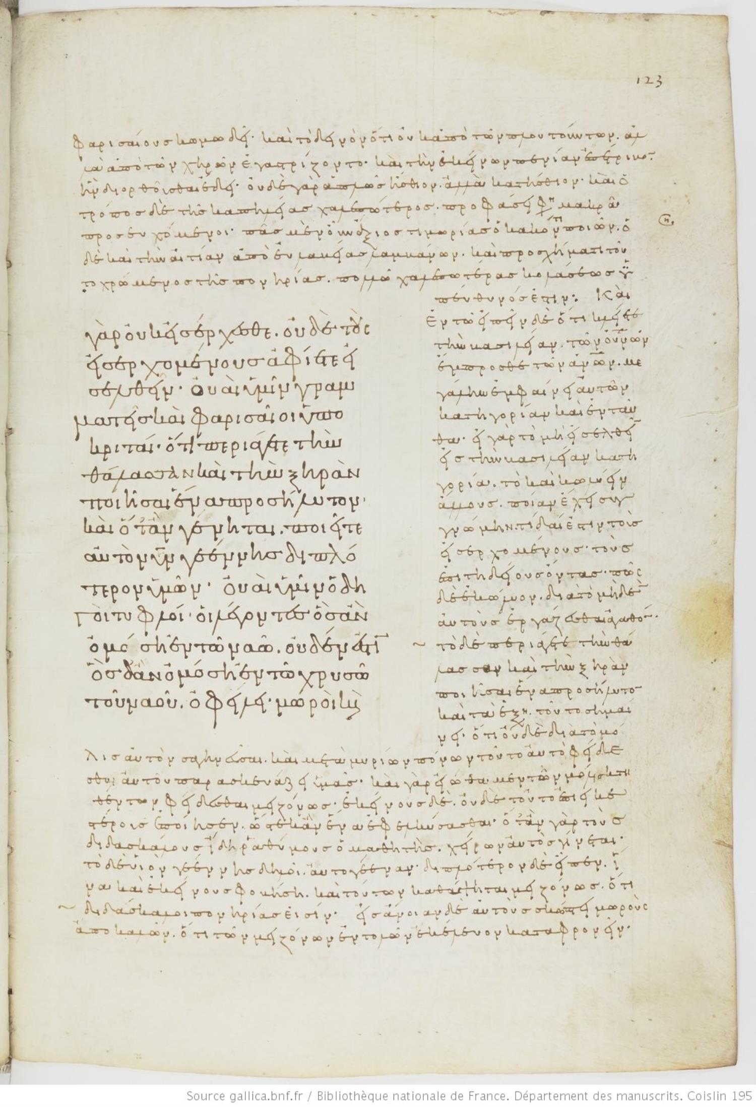 Tenth-century minuscule of the Gospels with commentary on parchment; 469 leaves, 1 column, varying number of lines per column. Images are made available by the Bilbiothèque Nationale. For recent images, please visit BNF Gallica.