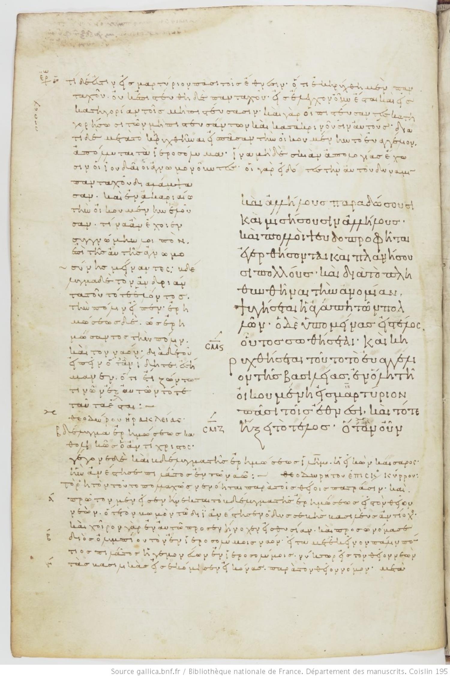 Tenth-century minuscule of the Gospels with commentary on parchment; 469 leaves, 1 column, varying number of lines per column. Images are made available by the Bilbiothèque Nationale. For recent images, please visit BNF Gallica.