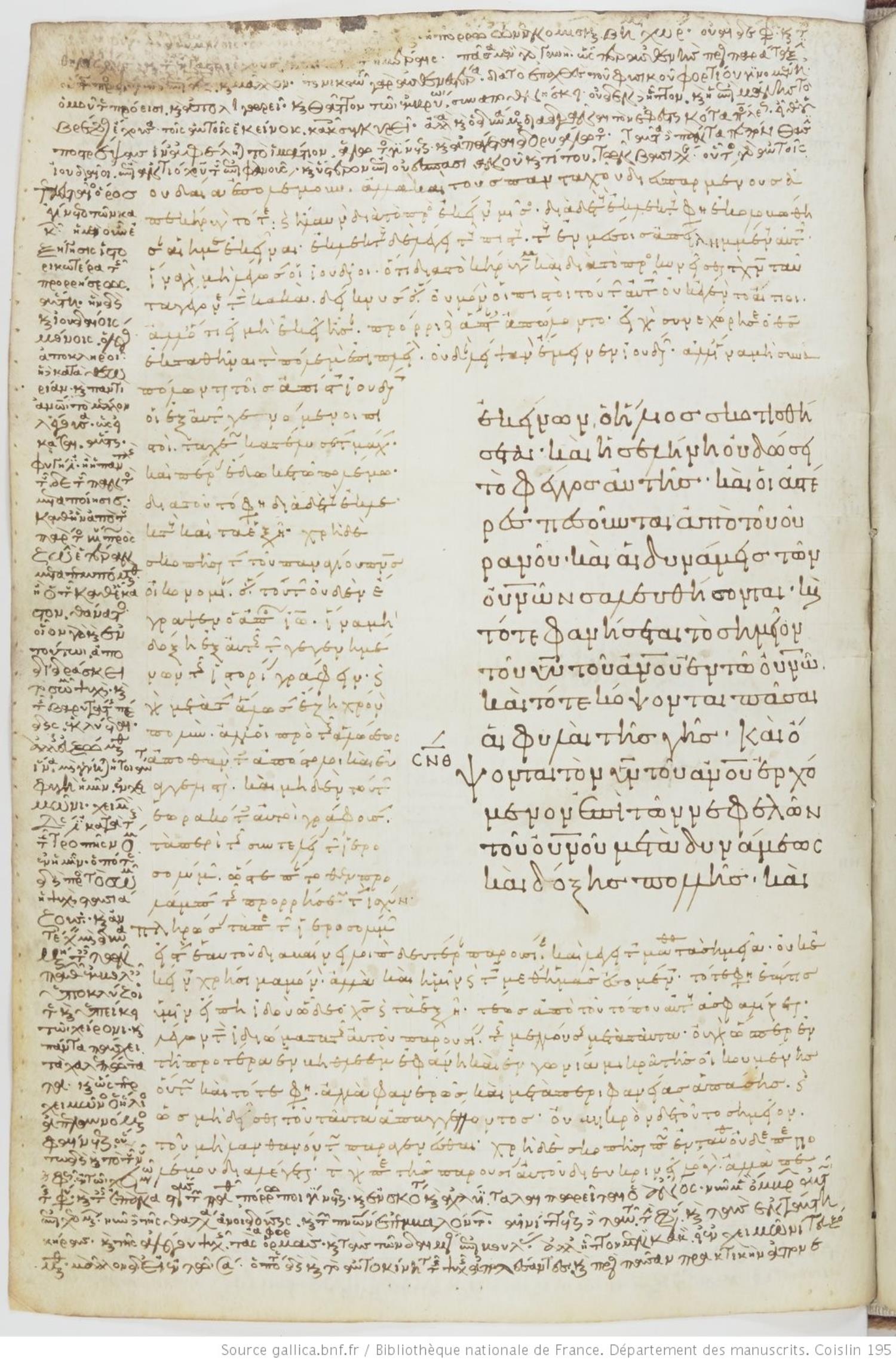 Tenth-century minuscule of the Gospels with commentary on parchment; 469 leaves, 1 column, varying number of lines per column. Images are made available by the Bilbiothèque Nationale. For recent images, please visit BNF Gallica.