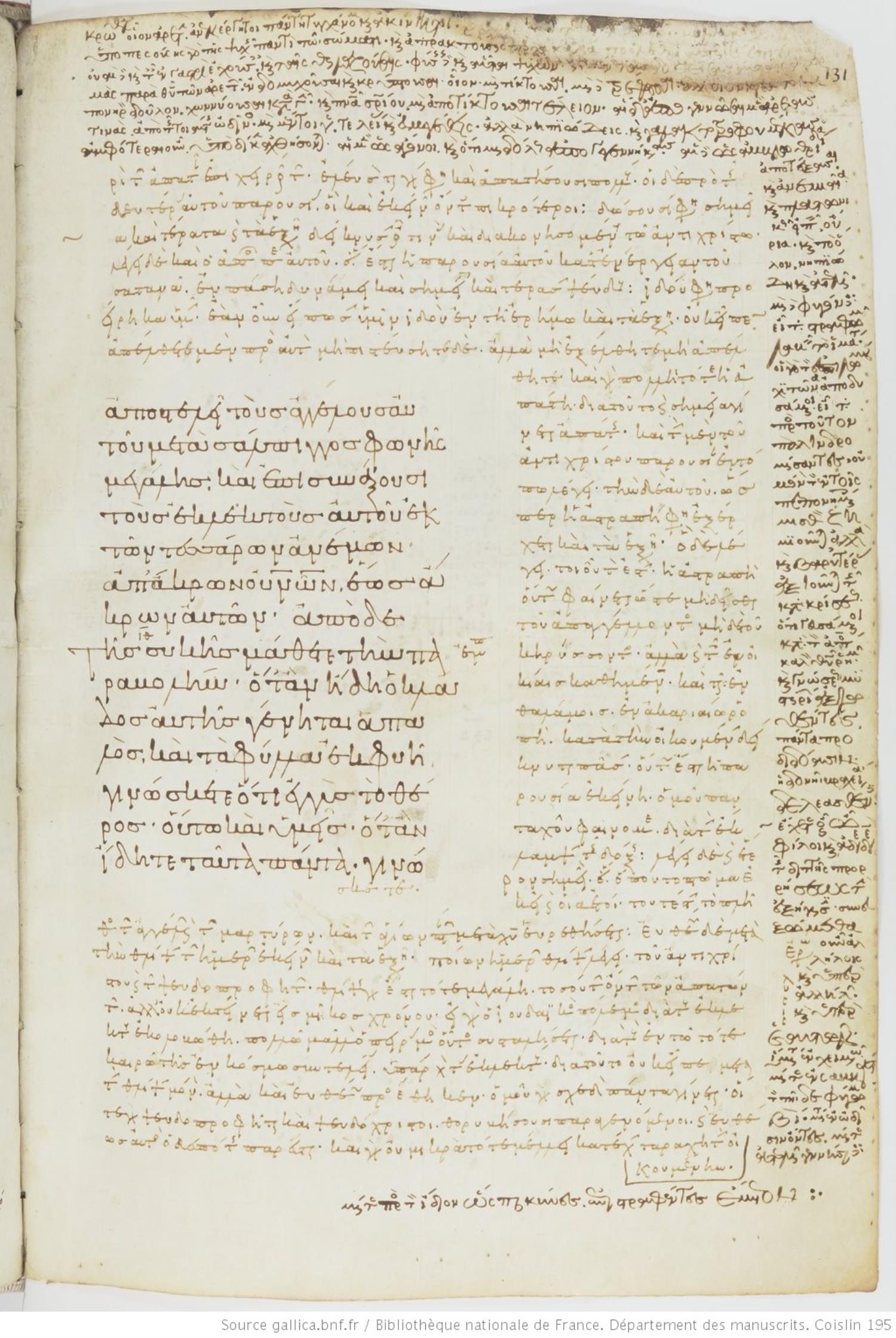 Tenth-century minuscule of the Gospels with commentary on parchment; 469 leaves, 1 column, varying number of lines per column. Images are made available by the Bilbiothèque Nationale. For recent images, please visit BNF Gallica.