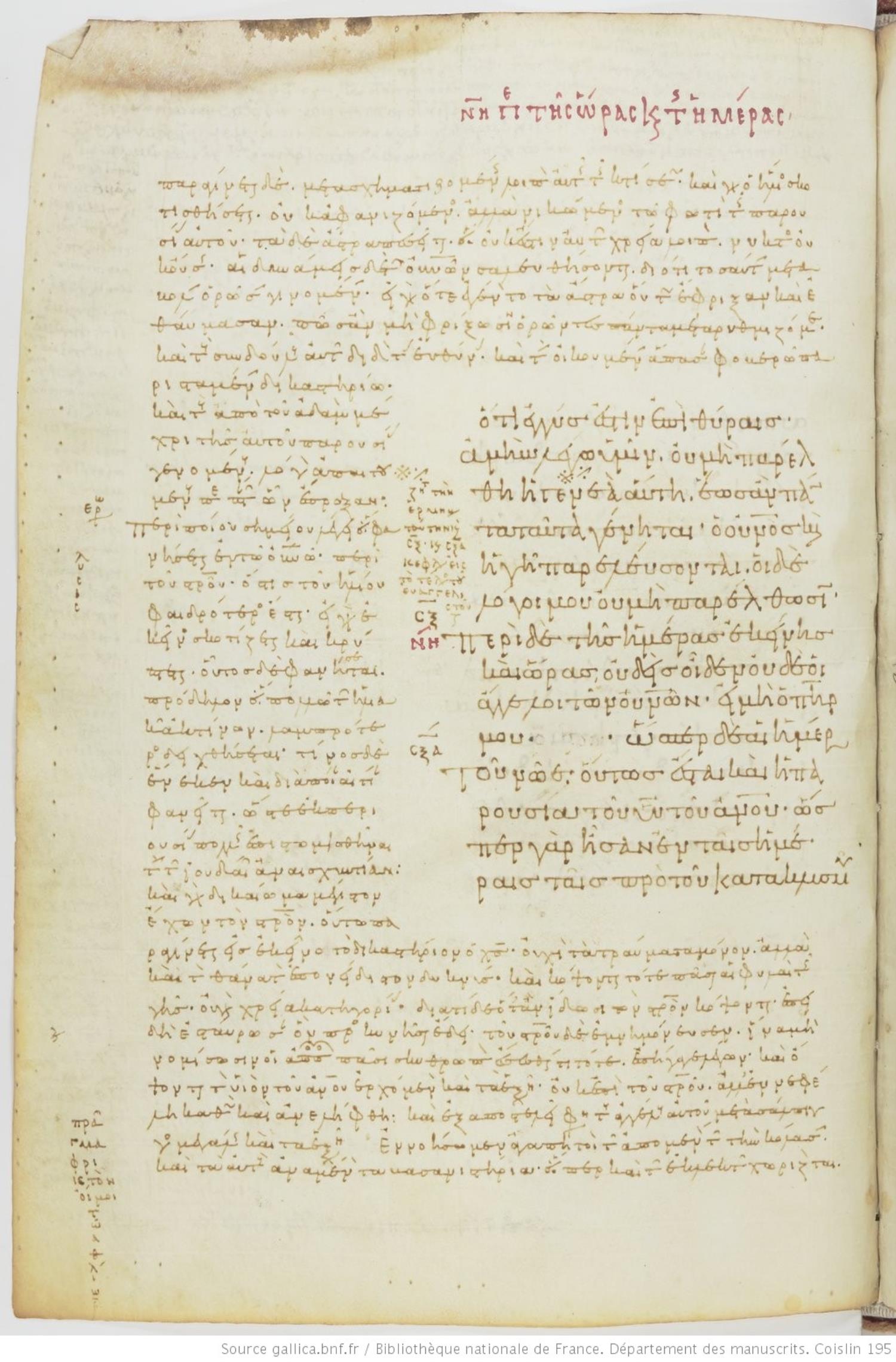 Tenth-century minuscule of the Gospels with commentary on parchment; 469 leaves, 1 column, varying number of lines per column. Images are made available by the Bilbiothèque Nationale. For recent images, please visit BNF Gallica.