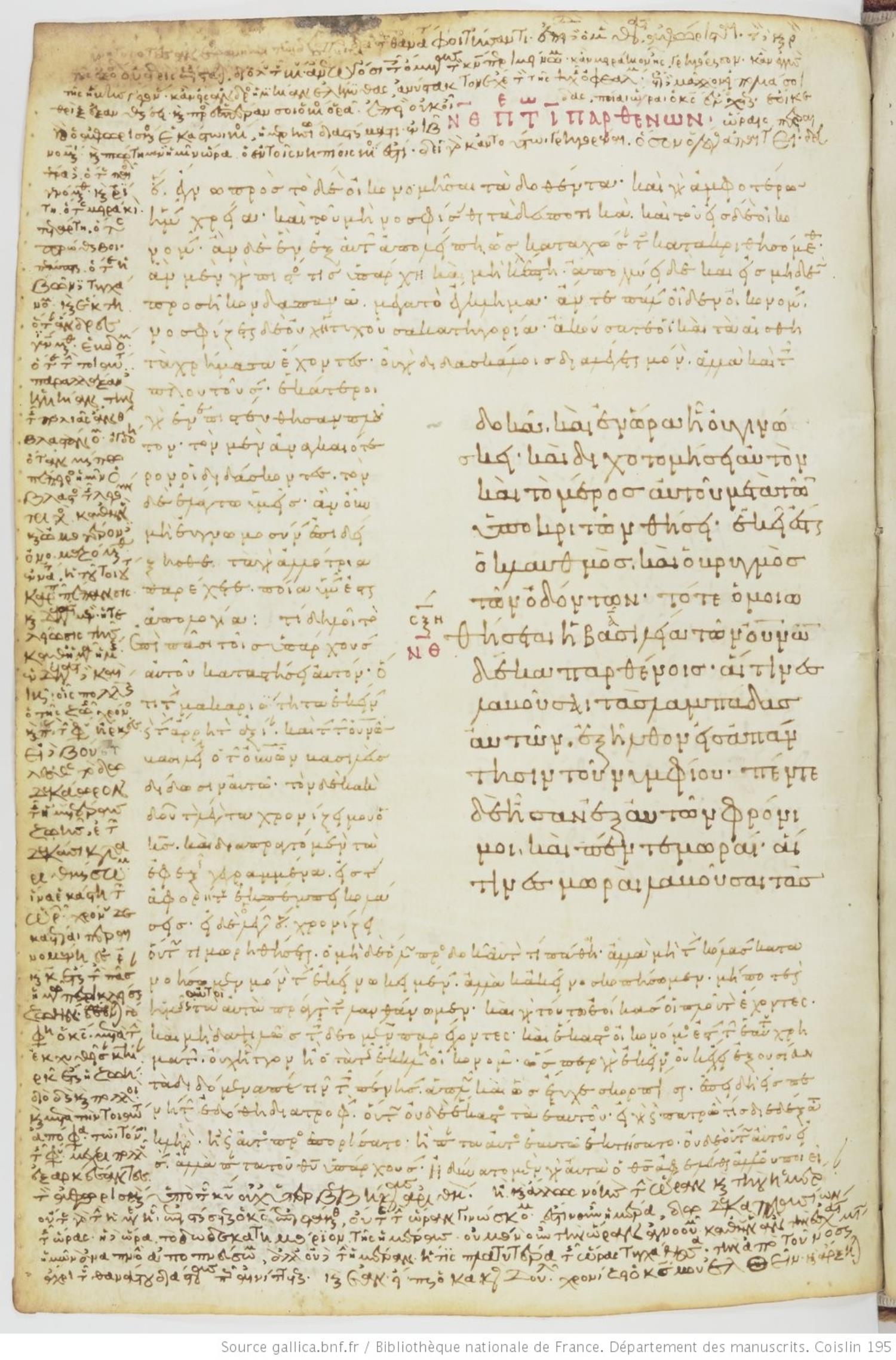 Tenth-century minuscule of the Gospels with commentary on parchment; 469 leaves, 1 column, varying number of lines per column. Images are made available by the Bilbiothèque Nationale. For recent images, please visit BNF Gallica.
