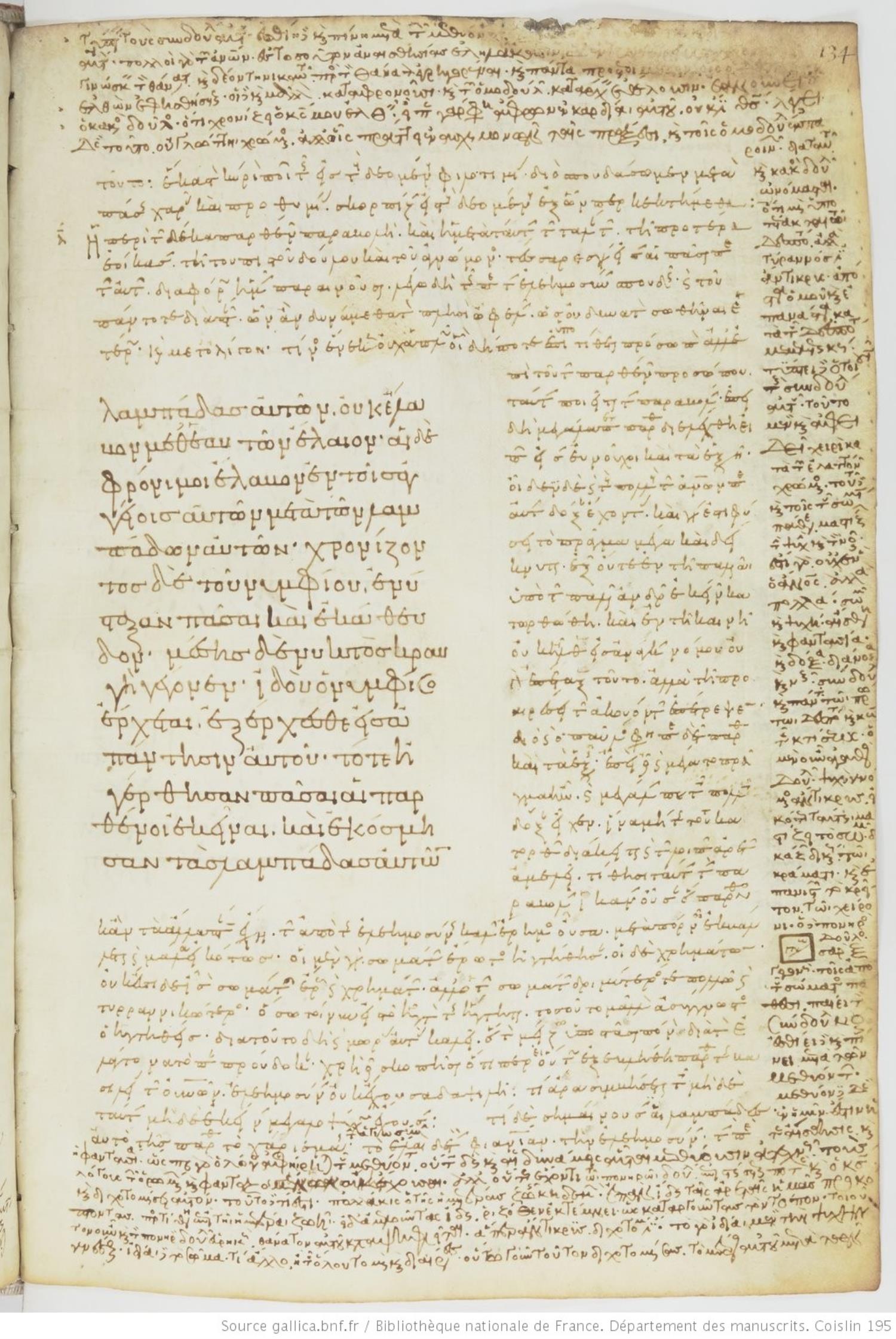 Tenth-century minuscule of the Gospels with commentary on parchment; 469 leaves, 1 column, varying number of lines per column. Images are made available by the Bilbiothèque Nationale. For recent images, please visit BNF Gallica.