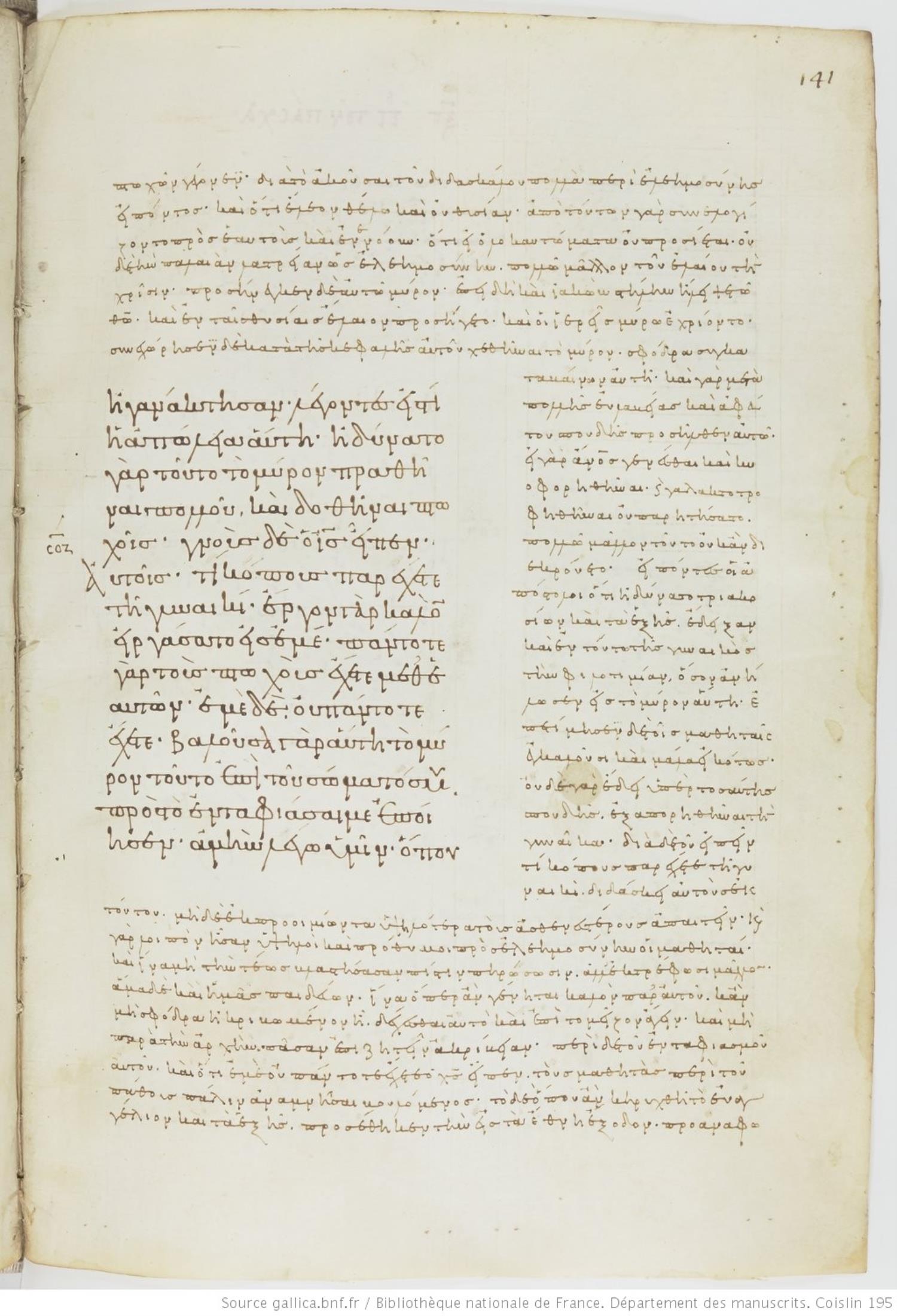 Tenth-century minuscule of the Gospels with commentary on parchment; 469 leaves, 1 column, varying number of lines per column. Images are made available by the Bilbiothèque Nationale. For recent images, please visit BNF Gallica.